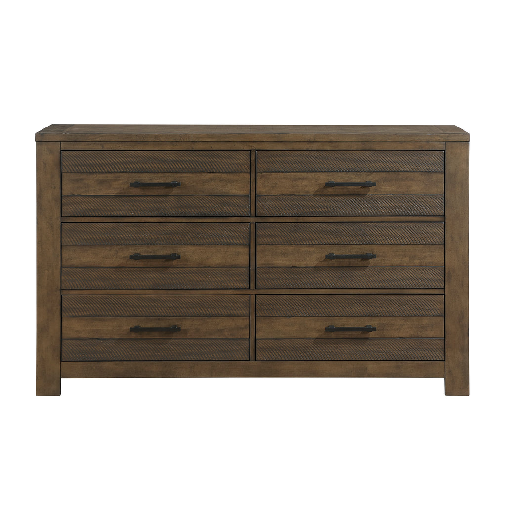 In a blend of transitional lines, industrial accenting and rustic textures, the design of the Conway Collection emerges, its bold look a complement to your homes unique look. The antique brown finish over birch veneer of the rough-hewn boards that comprise the design of the dresser are paired with flat black-tone bar hardware, fronting the drawers of the piece, further lending to the rusticated aesthetic of the collection.PRODUCT DIMENSIONS:Overall Dimension: 66.5" x 18" x 40"HDrawer interior: 27" x 13.5" x 7" (6)Listing Includes: One Dresser Only.Mirror: Not included.Simple Assembly Require