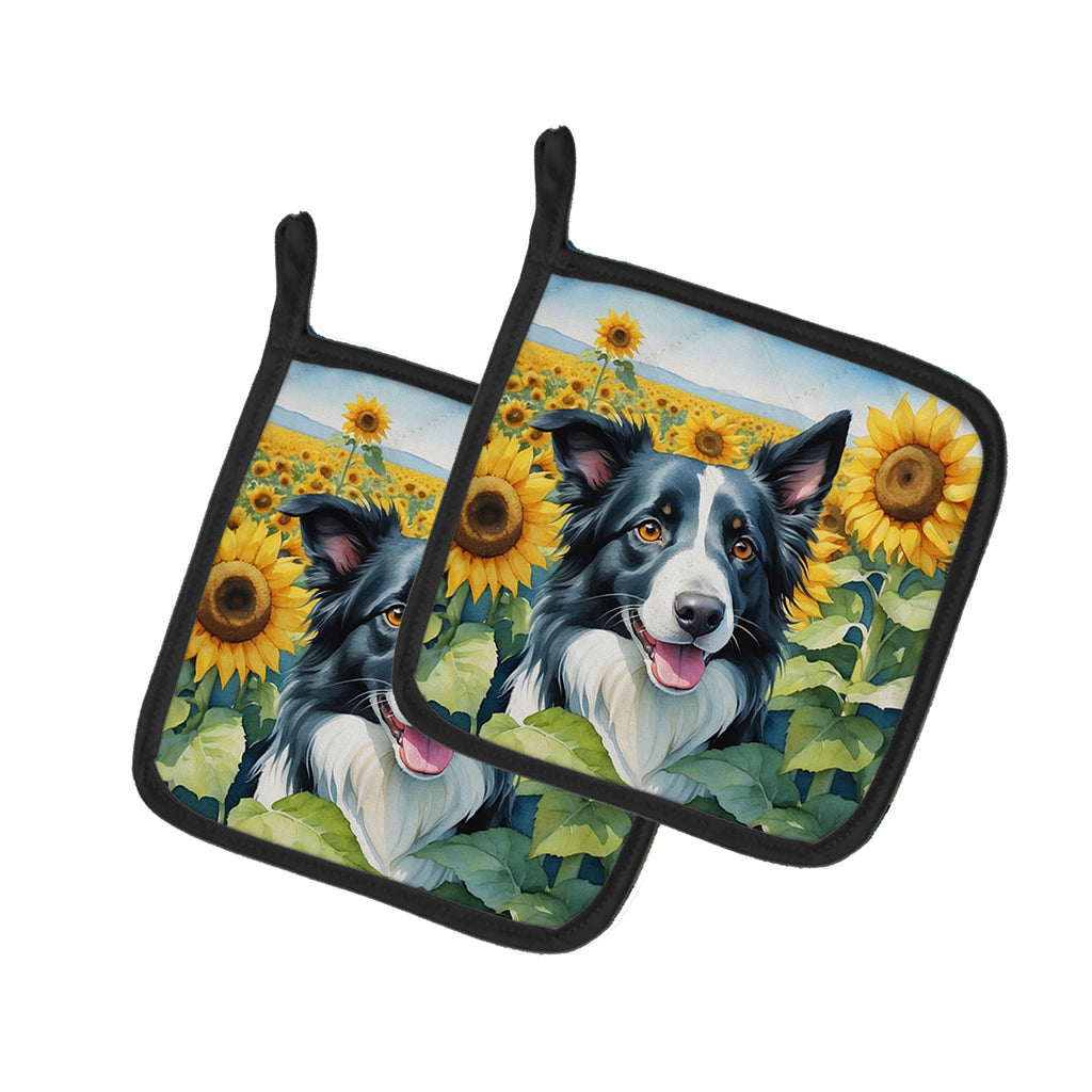 Border Collie in Sunflowers Pair of Pot Holders | Heat Resistant Oven Hot Pads for Cooking, Baking & BBQ