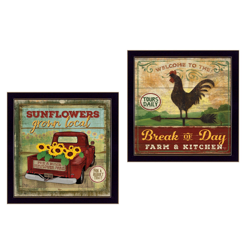 "Break of Day"- Sunflowers is a Vignette of 2-14" x 14" Framed in a decorative Black frames; prints by Mollie B. 1- Print is MOL1568 sunflowers from the Farm, features an old Pick up truck carrying a stock of sunflowers. The other print Welcomes you to the farm, and shows at day break that a rooster is going to crow. . The print has a protective, archival finish (glass is not needed) and arrives ready to hang. •Women Owned (WBE)•Textured Artwork with a 'rolled on' acid free acrylic coating to create a canvas painting effect. No glass is necessary.•UV protectant coating protects artwork from fading.•Arrives Ready to Hang