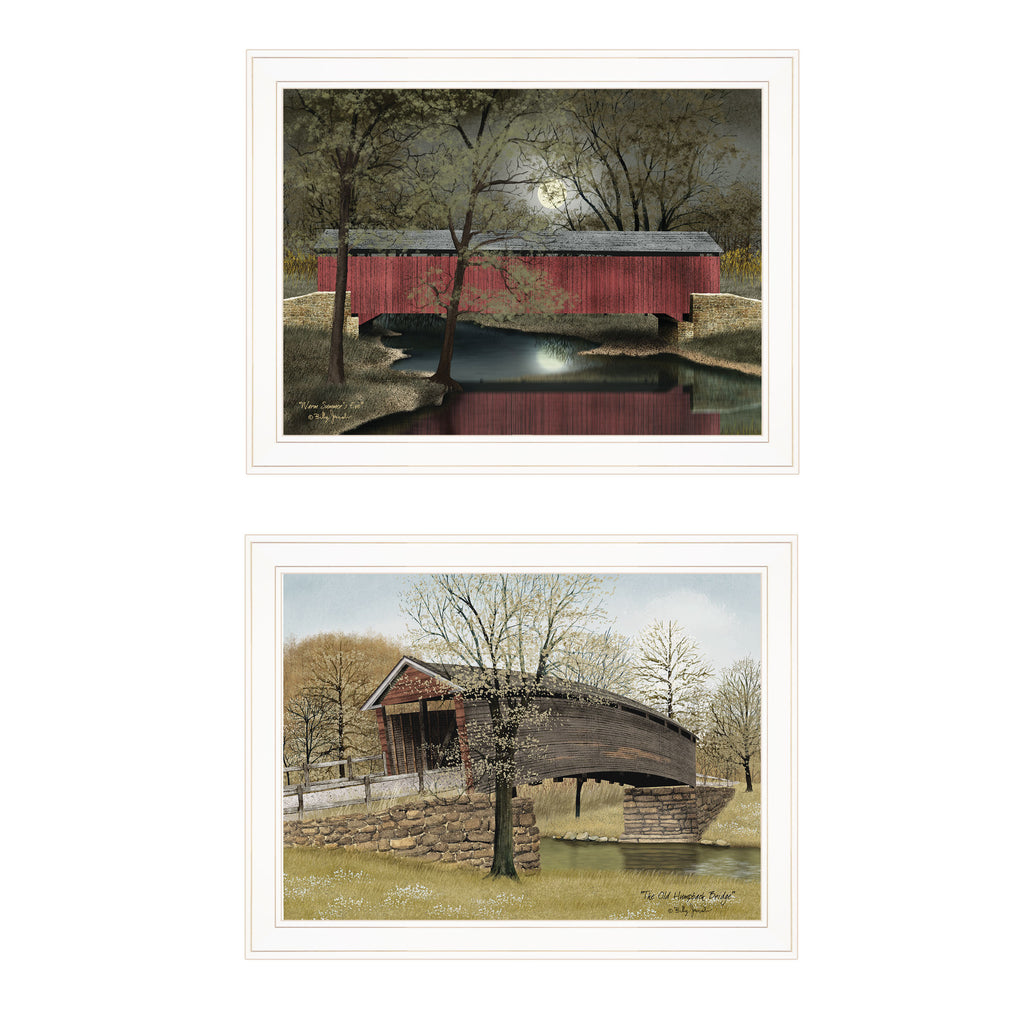 V635-226G Bridge Collection I vignette by Billy Jacobs. This 2- piece white framed vignette of Covered Bridges (BJ1047GP-Old Humpback Bridge & BJ1048GP-Warm Summer Eve) framed size for each 27"x21". This vignette of covered bridges are from Billy Jacobs collection of artwork. This framed art is totally American made. The surface of the art is coated with a fade resistant texture which gives it a canvas-like appearance. No glass is necessary. Arrives ready to hang.•Print has fade resistant surface texture, no glass is necessary•Woman Owned Busines (WBE)•Arrives ready to hang, no additional hardware needed on item•individually hand crafted by skilled American workers•Decorative grouping in matching frames