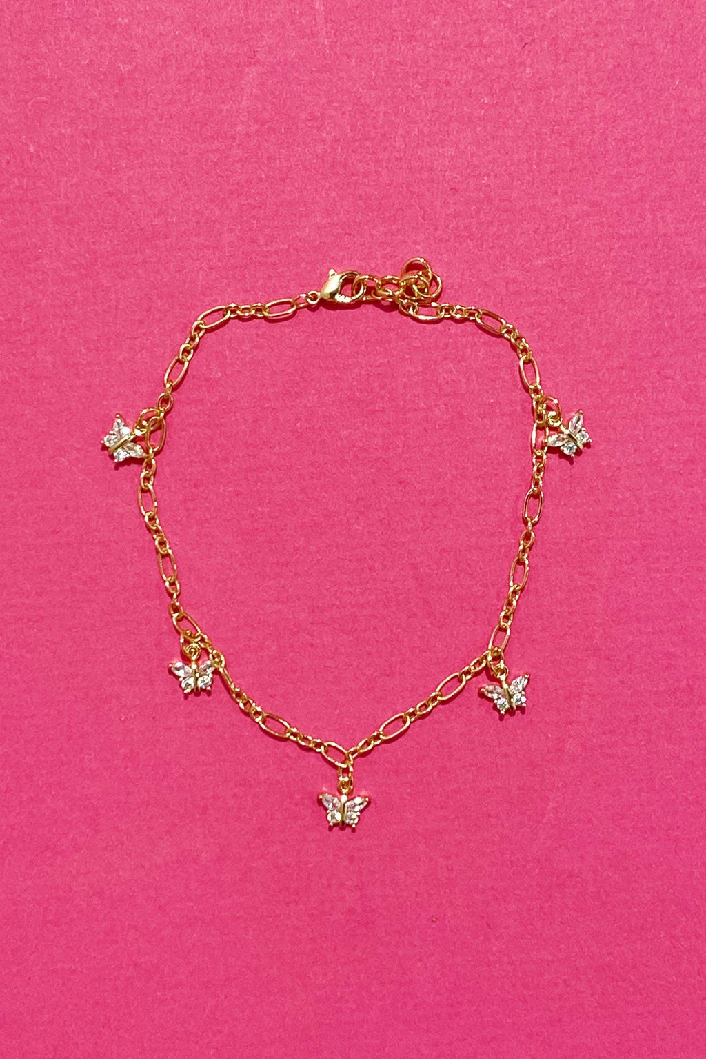 Exquisite anklet with dangling butterflies with jewel detailing hanging throughout the Gold chain.
