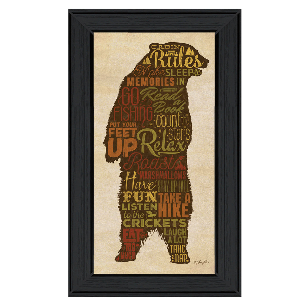 RAD1088-405, "Cabin Rules" is a 12"x21" framed art print by Lauren Rader. This decorative black framed print is uniquely written on the background of a bear. Script says: Cabin Rules, Make memories in sleep, read a book, count the stars, relax, put your feet up, roast marshmallows, have fun, stay up late, listen to the crickets, laugh a lot, take a nap. The print has a protective, archival finish (glass is not needed) and arrives ready to hang. Made in the USA with pride by skilled American workers.•Textured Artwork with a 'rolled on' acid free acrylic coating to create a canvas painting effect. No glass is necessary.•Surface of the print has a fade resistant coating.•Arrives Ready to Hang•Woman Owned Business (WBE)•Handmade in the USA•Decorative Moulding adds natural beauty to the framed art.