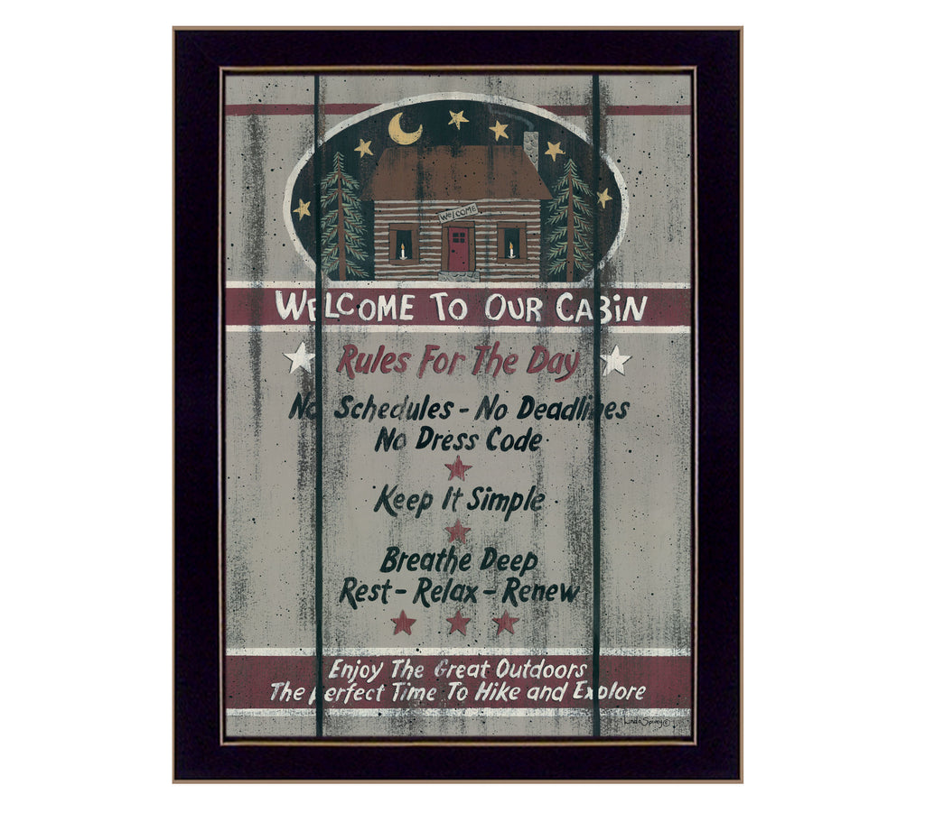 LS1542-712 Cabin Rules by artisan Linda Spivey. This decorative black framed print(14x20) is rules for the cabin; which is a good thing to have posted. No Schedules, No deadlines, no dress code, breathe deep and relax. Print are textured-no need for glass. •TEXTURED ARTWORK with a 'rolled on' acid-free acrylic coating to create a canvas painting effect.•UV PROTECTANT COATING protects artwork from fading. No glass is necessary.• MOULDING adds natural beauty to the framed art. Frame is keyholed for the easy hanging.•THIS FINE HOME DECOR piece made in the USA by Woman Owned Business (WBE) is a perfect gift for a friend or relative.