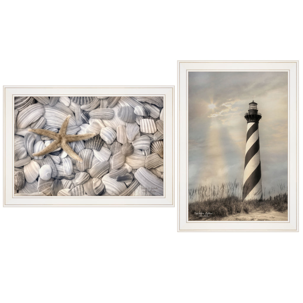 VLD402-226G "Cape Hatteras Lighthouse & Sea Shells" by Lori Deiter. Two white 21x15, 15x21 framed print reminds you of your visit to Cape Hatteras; the lighthouse and the sea shells. This framed art is totally American made. The surface of the art is coated with a fade resistant texture which gives it a canvas-like appearance. No glass is necessary. Arrives ready to hang. •Women Owned (WBE)•Textured Artwork with a 'rolled on' acid free acrylic coating to create a canvas painting effect. No glass is necessary.•UV protectant coating protects artwork from fading.•Molding adds natural beauty to the framed art. Frame is keyholed for ease of hanging.•Frame is keyholed for ease of hanging.