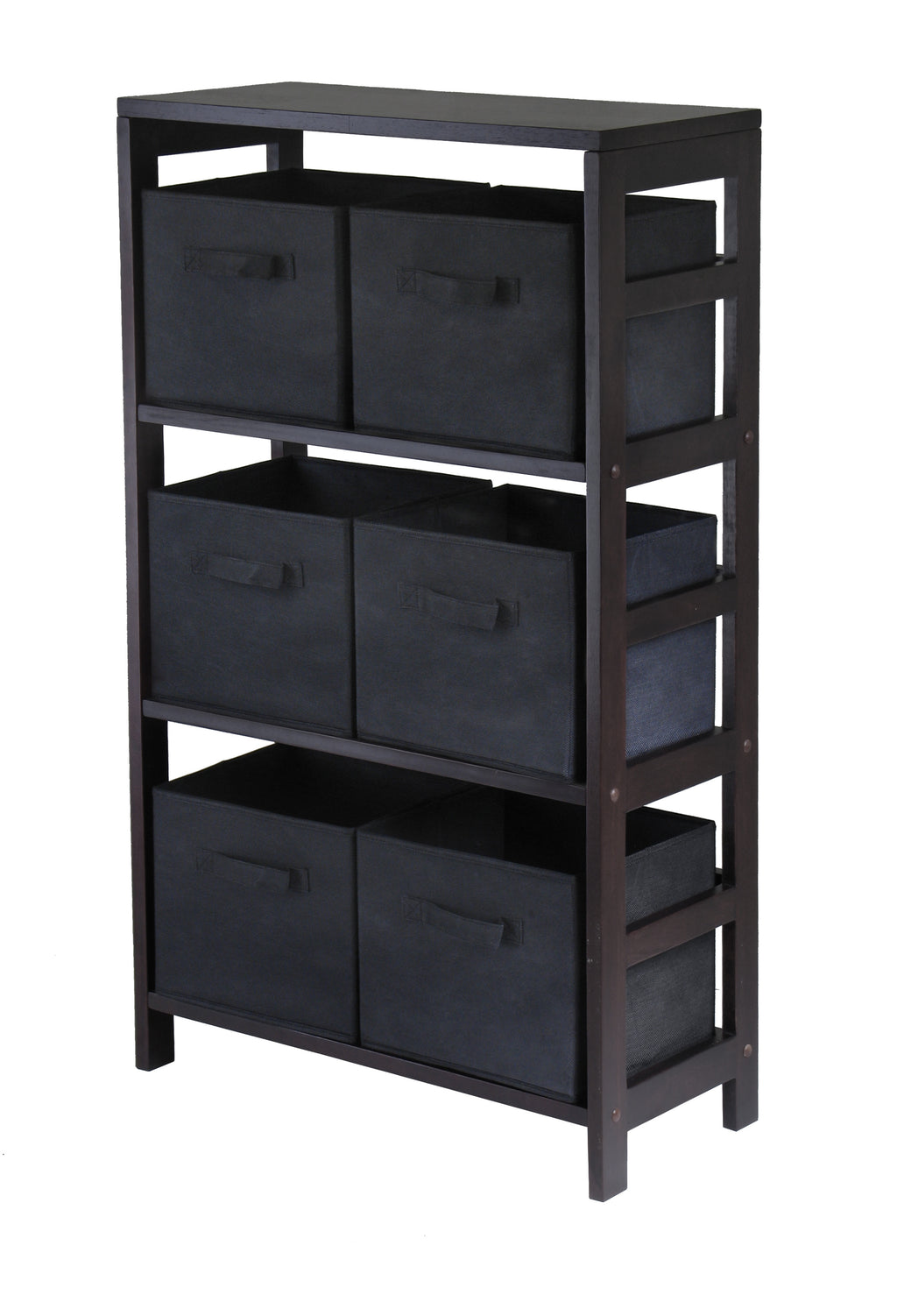 The Capri 7-PC Storage Shelf Set comes with 6 foldable black fabric baskets and is perfect for keeping any room tidy and organized. The wide shelf design and warm walnut finished shelf is perfect for any room in your home and can be used as a standalone bokcase or shelf but is accented well with the black fabric baskets. The overall shelf size is 25.2"W x 11.2"D x 42"H with each shelf at 23.6"W x 11.1"D and a top shelf dimension of 25.2"W x 11.2"D. Made of solid wood in an espresso finish and the baskets are made out of fabric in black finish. Assembly required. Shelf: 51.5x13.25x4.25; Shelf: 51.5x13.25x4.25;