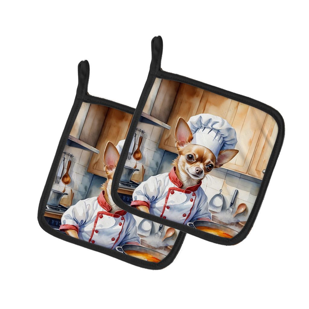 Pair of Pot Holders featuring breed specific Chihuahua artwork. A Pair of Pot Holders to match your kitchen decor. Made in the USA these are thick and functional. Full color artwork decorates the front polyester fabric of the hot pad and accented by a black trim. Use these at as a trivet for your Thanksgiving or Christmas tablescape. Filled with insulated fabric and quilted for durability. These colorful pot holders will make a great gift for your favorite home cook or executive chef. Each pot holder measures approximately 7 1/2 inches by 7 1/2 inches. A hanging tab is included.