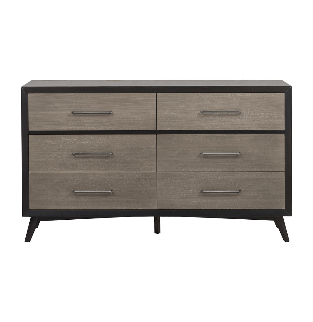 Danish mid-century modern design is well exemplified in the Raku Collection serving as stylish addition to your bedroom décor. Classic elements of understated retro design combine with the two-tone finish - barnwood gray fronts and black profile - over walnut veneer and antique pewter bar hardware to blend effortlessly creating a sophisticated modern look for your bedroom. Elongated, tapered turned legs support each piece of the collection.PRODUCT DIMENSIONS: Overall Dimension: 60.25" x 17" x 36"HDrawer interior: 26.46" x 12.64" x 6.18" (6)Listing Includes: One Dresser Only.Mirror: Not included.Simple Assembly Require.