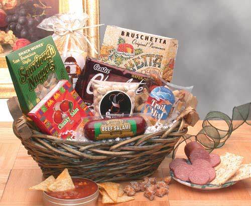 This lovely green wicker basket delivers classic snacks in high style when you send the Classic Snacks gift basket. Friends and family will enjoy the savory goodies for snack time or party time. Send a Classic Snack gift basket to someone you love today. The Classic Snack Gift Basket includes: Cheddar Cheese Flavor Pretzel Dipping Sticks, Parmesan Bruschetta Crisps Bag, Chunky Salsa 2 oz., Monterey Nacho Chips, 2 oz Tavolare Snack Mix, Gourmet Treats Pistachios, 3 oz. Beef Salami, 1.9 oz chocolate cream wafer cookie Chocolate Cream filled wafers cookies, Green Wicker BasketPrice includes Ground Shipping