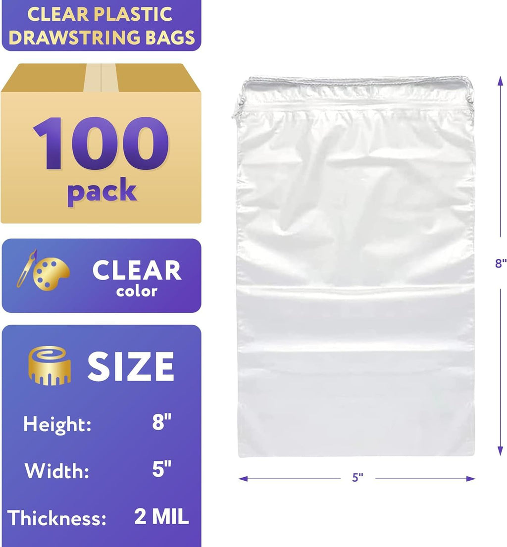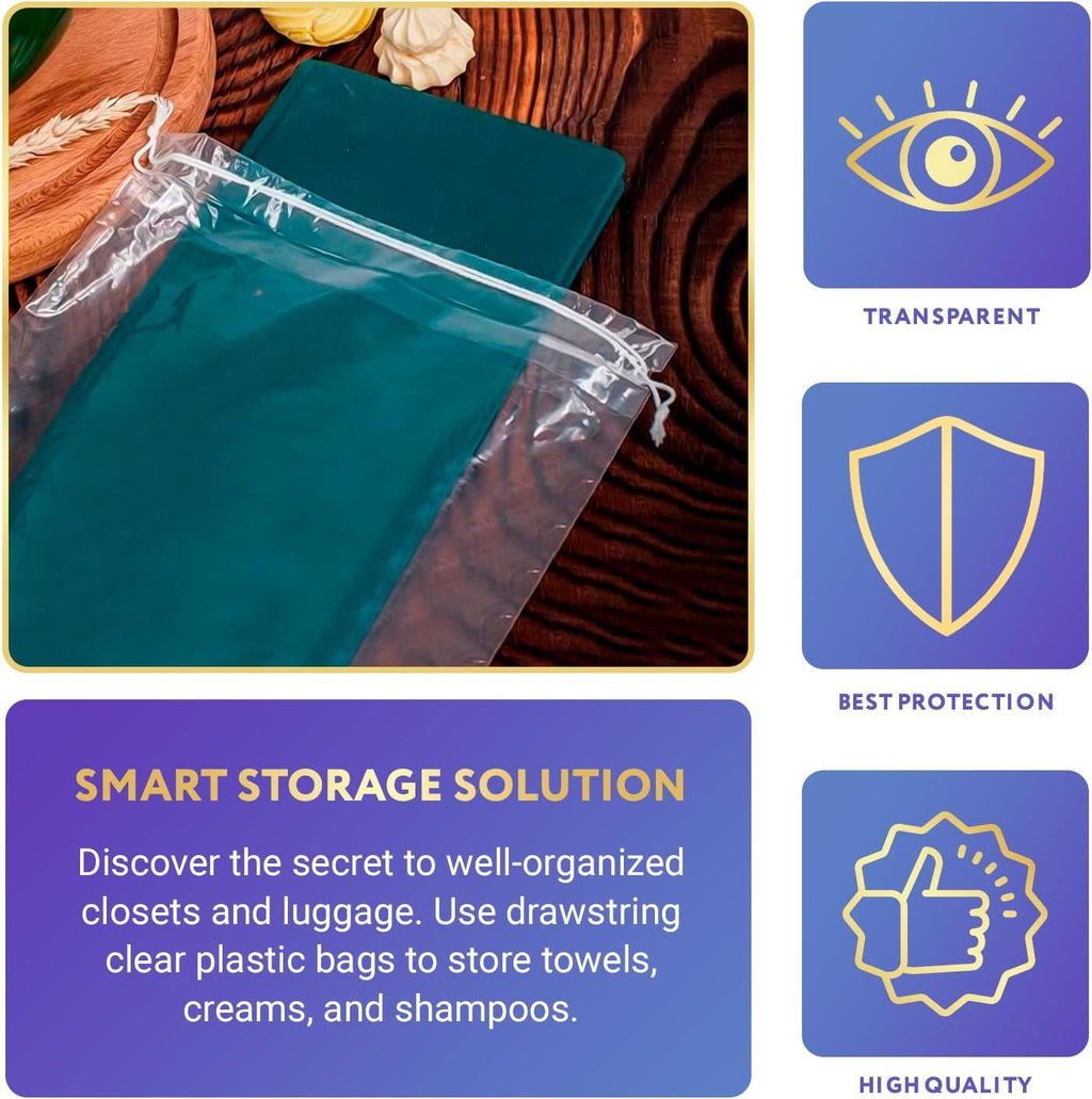 Home Improvement:Use APQ Clear Drawstring Bags for cute and comfortable storage of your kid's toys; beauty and clothes accessories; home decorations; kitchen supplies; bulk foods; delicious sweet candies; and multi-piece products.Art and Home Made Craft:Artist is not only about dominating in the chaos. It's about how you manage it! Now with our Clear Drawstring Bags; you can create without scarry:to lose your favorite pantone pencil; old school postcards and enshrining valentine's cards; your pieces and masterpieces; things for scrapbooking such as patterned paper; embellishments and/or stickers; photos etc.Create with comfort!Give each item its place under the bright light.Gifts:Promote Your Social Media Pages with giveaways in Clear Drawstring Bags. Raise your audience of fan base followers by sending them pretty little gifts in simple packaging. Share your items' homemade crafts or gifts sets with your clients; family members; relatives; friends; beloved people; coworkers.Sell:Are you a fresh businessman? But; you want to spread your ideas worldwide? Let's conquer this world together with positive vibes of high-quality clear packaging in the face of Clear Drawstring Bags.MaterialPlactic PolyethyleneLDPE (Low Density Polyethylene)LDPE (Low Density Polyethylene)PolyethyleneColorClearClearClearClearHigh Quality✓✓✓✓✓Wide Range of Application✓✓✓✓✓