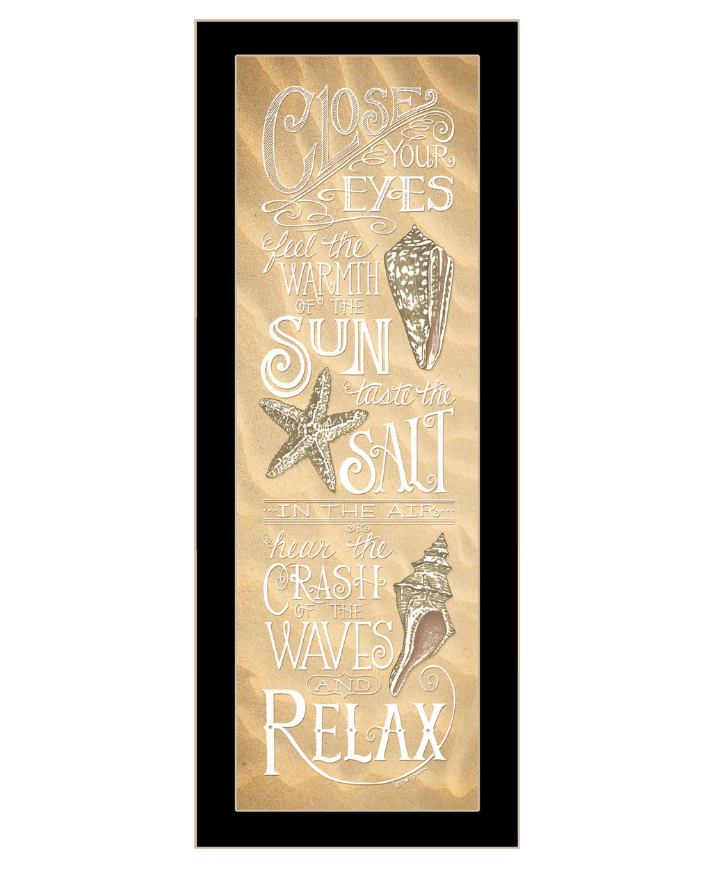 "Close Your Eyes" is by Artisan Deb Strain. This 14"X38" decorative black framed wall art. The ocean is calling and you can really feel it through this image. The sand looks like the water has washed over it and the shells are perfectly placed as if they have washed up on shore. The script reads "Close your eyes feel the warmth of the sun taste the salt in the air her the crash of the waves and relax.". Our products are proudly made by skilled American workers. The surface of our framed art is textured with a fade resistant coating, so no glass is necessary. A vegetable-based glue is used in the production of our products, and our frames are crafted from 100% recycled material. In keeping with our environmentally friendly approach towards manufacturing. Arrives ready to hang.•Print has fade resistant surface texture, no glass is necessary•Woman Owned Business (WBE)•Arrives ready to hang, no additional hardware needed on item•individually hand crafted by skilled American workers•Cleaning Instructions: Clean with Soft Dry Cloth Only•Made in U.S.A.•Artwork by American Artist