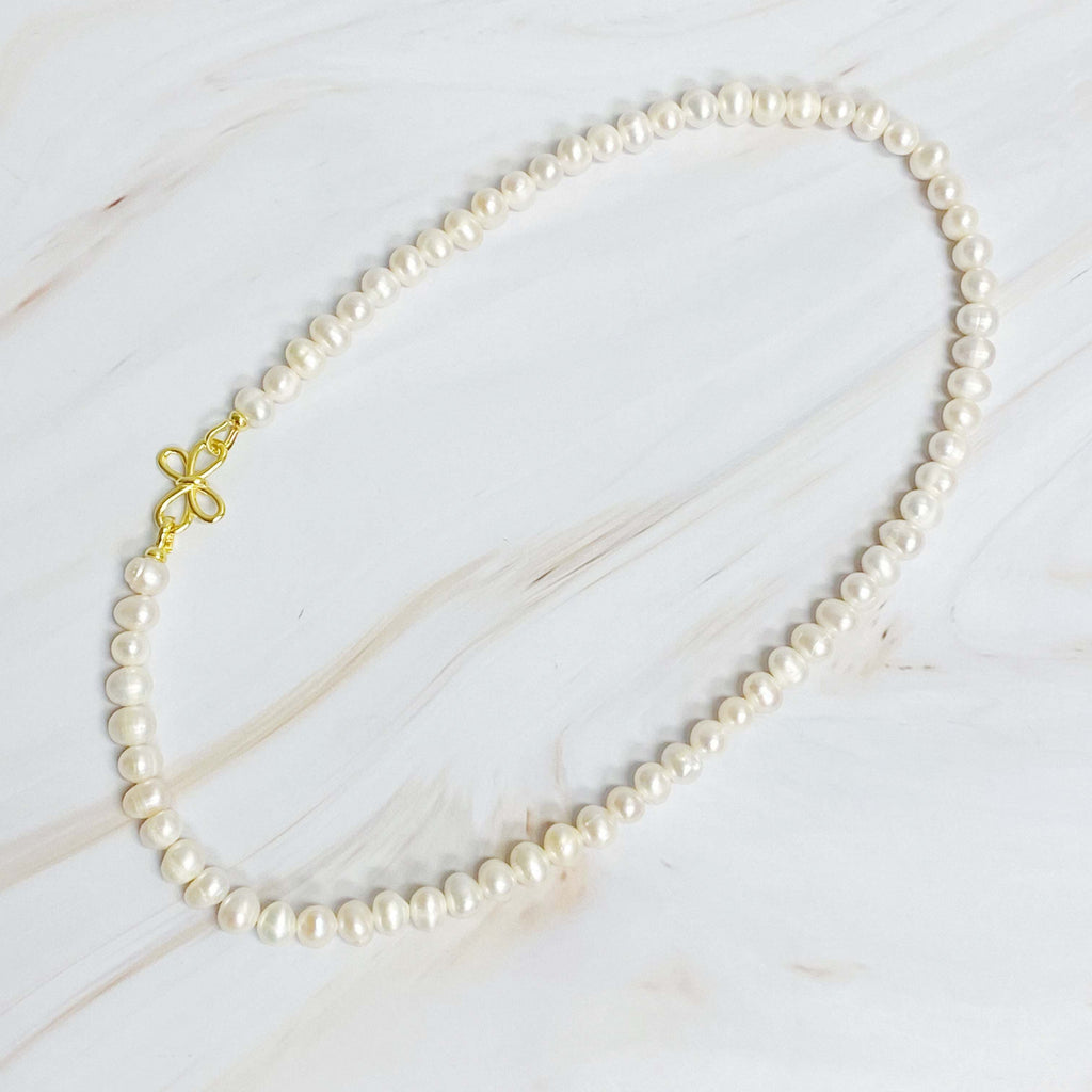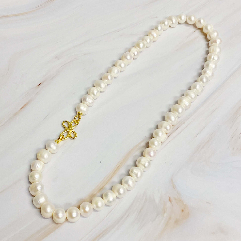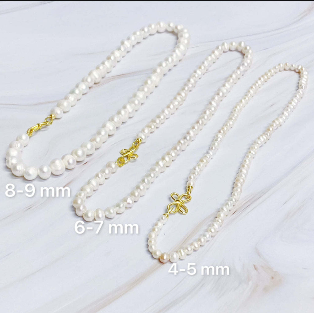 Introducing the Clover Clasp Pearl Necklace, a symbol of sophistication and grace. This necklace features freshwater pearls in three sizes: 4-5mm for a subtle layered look, 6-7mm for an elegant touch, and 8-9mm for a statement piece. The unique clover clasp provides versatility and style, allowing you to wear it in front, on the side, or in the back. With a clasp that opens from both sides, you can easily adjust the length for any occasion. Elevate your look with this timeless and versatile necklace.
