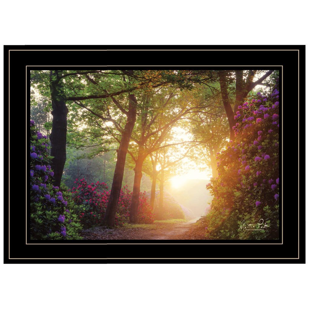 MPP438-704G "Color Overdose" by artisan Martin Podt. This decorative black framed print (21x15) of colorful tree lined walking path is breath-taking. Sun shining on the walk way, flowers in full bloom and fully covered by the trees. This framed art is totally American made. The surface of the art is coated with a fade resistant texture which gives it a canvas-like appearance. No glass is necessary. Arrives ready to hang. To view a 2-piece vignette, including this print, please search: V615-704G •Print has fade resistant surface texture, no glass is necessary•Woman Owned Busines (WBE)•Arrives ready to hang, no additional hardware needed on item•individually hand crafted by skilled American workers•frame mitered with precision equipment