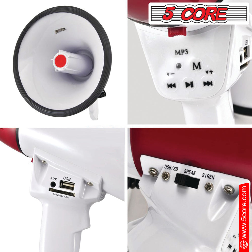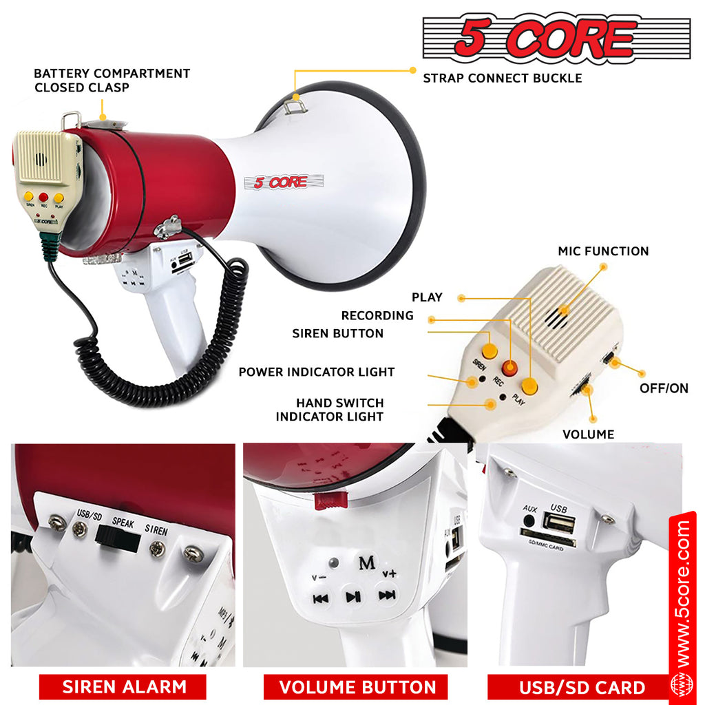 The 66SF megaphone speaker offers portable, high-powered audio projection! Each iteration of the megafono bull horns has improved battery life, audio quality, and ergonomic design. Control crowds from up to 1000 yards with its handheld wireless performance. The megaphone speaker features a button-activated siren, recording, and a flexible wired microphone for easy voice projection. Powered by (8) rechargeable C batteries(not included), it’s a battery-operated solution for portable PA speaker control. Get it with the 5 Core megaphone speaker. |