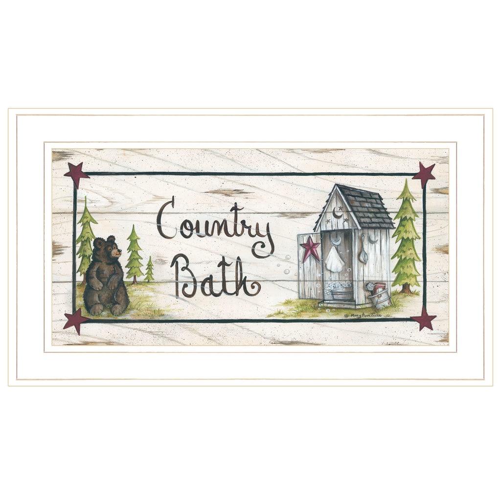 Mary 456-226G "Country Bath" by artisan Mary Ann June. This decorative white framed print (21x12)of a outhouse in the nature; and a bear looking on. The tub of suds for bathing, a towel all ready and decorations of half moon and stars. This framed art is totally American made. The surface of the art is coated with a fade resistant texture which gives it a canvas-like appearance. No glass is necessary. Arrives ready to hang. To view a 2-piece vignette, including this print, please search: V646-226G •Print has fade resistant surface texture, no glass is necessary•Woman Owned Busines (WBE)•Arrives ready to hang, no additional hardware needed on item•individually hand crafted by skilled American workers•frame mitered with precision equipment•Framed art with no glass for safety around children