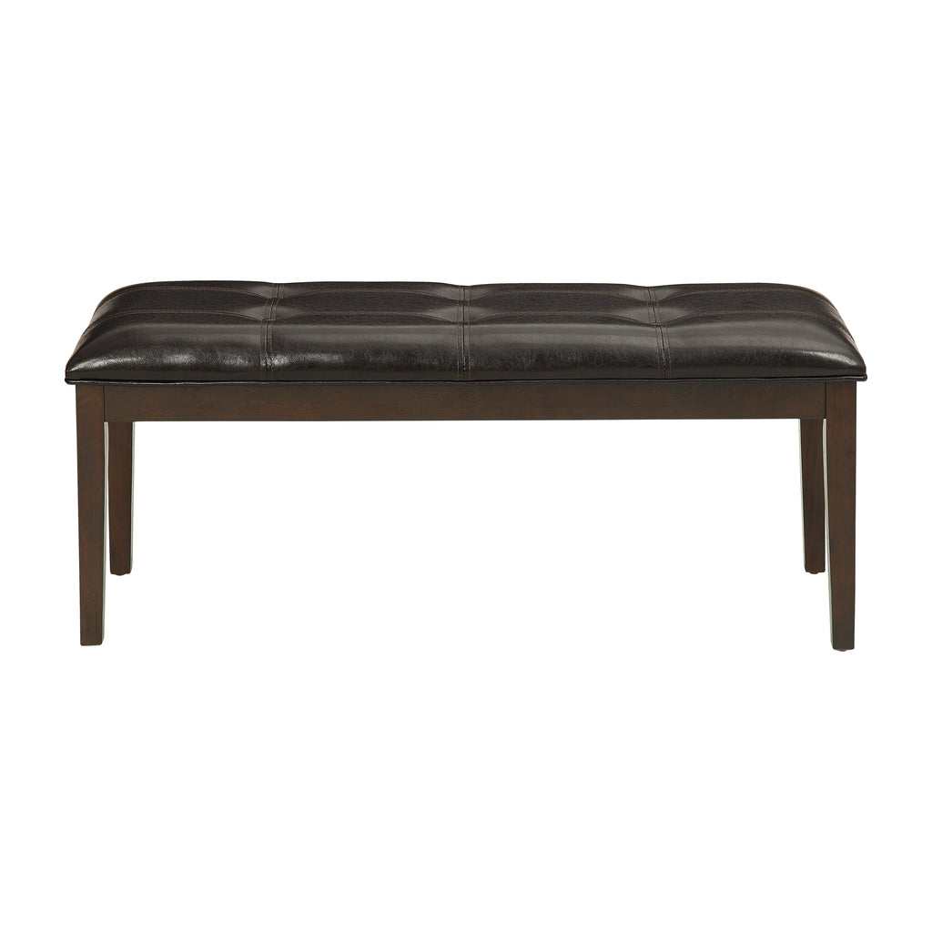 The casual Decatur Collection is the transitional style that you have been searching for in your dining space. Basswood veneer covers the legs, with dark cherry finish, that support the classic profile of the 49-inch bench seat, which is covered in dark brown faux leather, with tufted accenting.PRODUCT DIMENSIONS: Overall Dimension: 49" x 18" x 20"HSeat Width: 49"Seat Depth: 18"Seat Height: 20"Listing Includes: One Bench Only.Dining Table and Chairs : Not included.Simple Assembly Require