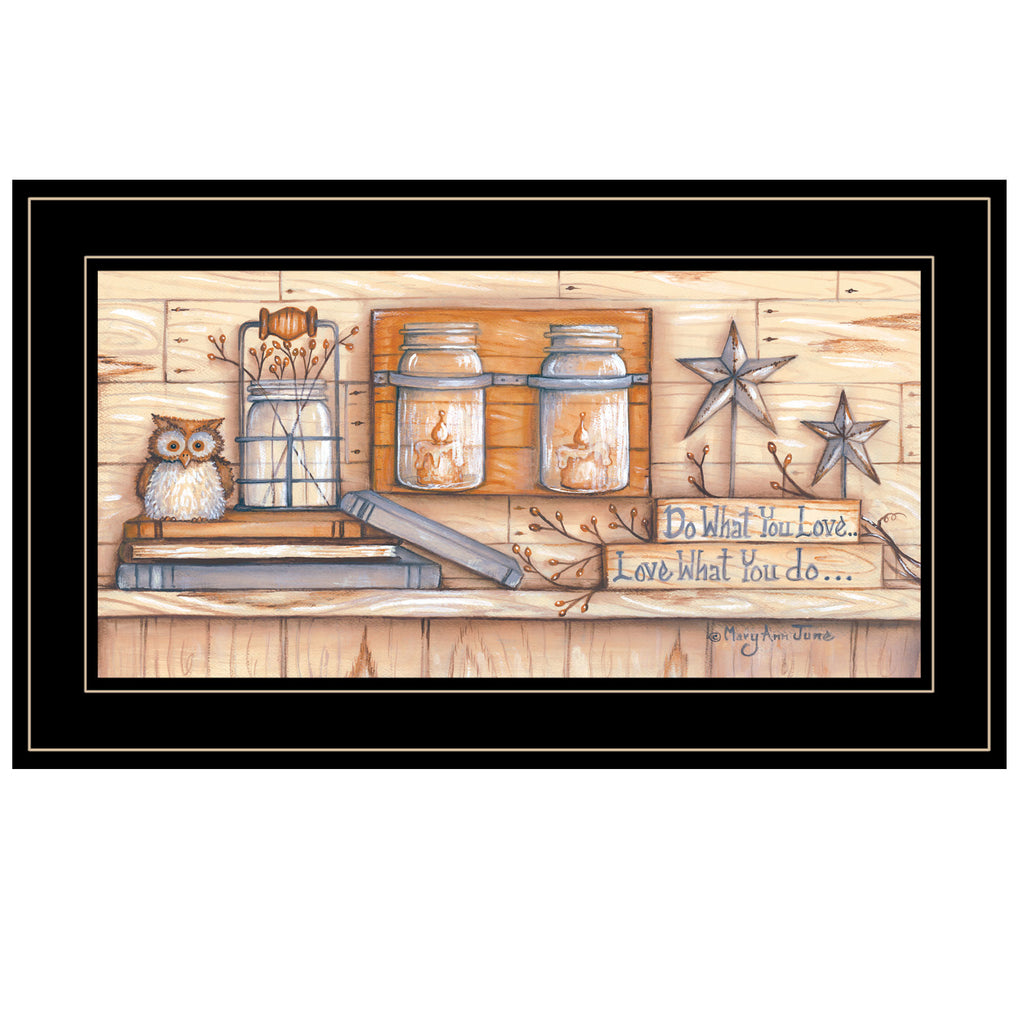 Mary486-704G "Do What You Love" by artisan Mary June. This decorative black framed print (21x12) of primitive items: barn star, nature, owl, bottles with candles, books and a sign that says: Do What You Love. This framed art is totally American made. The surface of the art is coated with a fade resistant texture which gives it a canvas-like appearance. No glass is necessary. Arrives ready to hang. To view a 2-piece vignette, including this print, please search: V627-704G•Print has fade resistant surface texture, no glass is necessary•Woman Owned Busines (WBE)•Arrives ready to hang, no additional hardware needed on item•individually hand crafted by skilled American workers•frame mitered with precision equipment•Framed art with no glass for safety around children