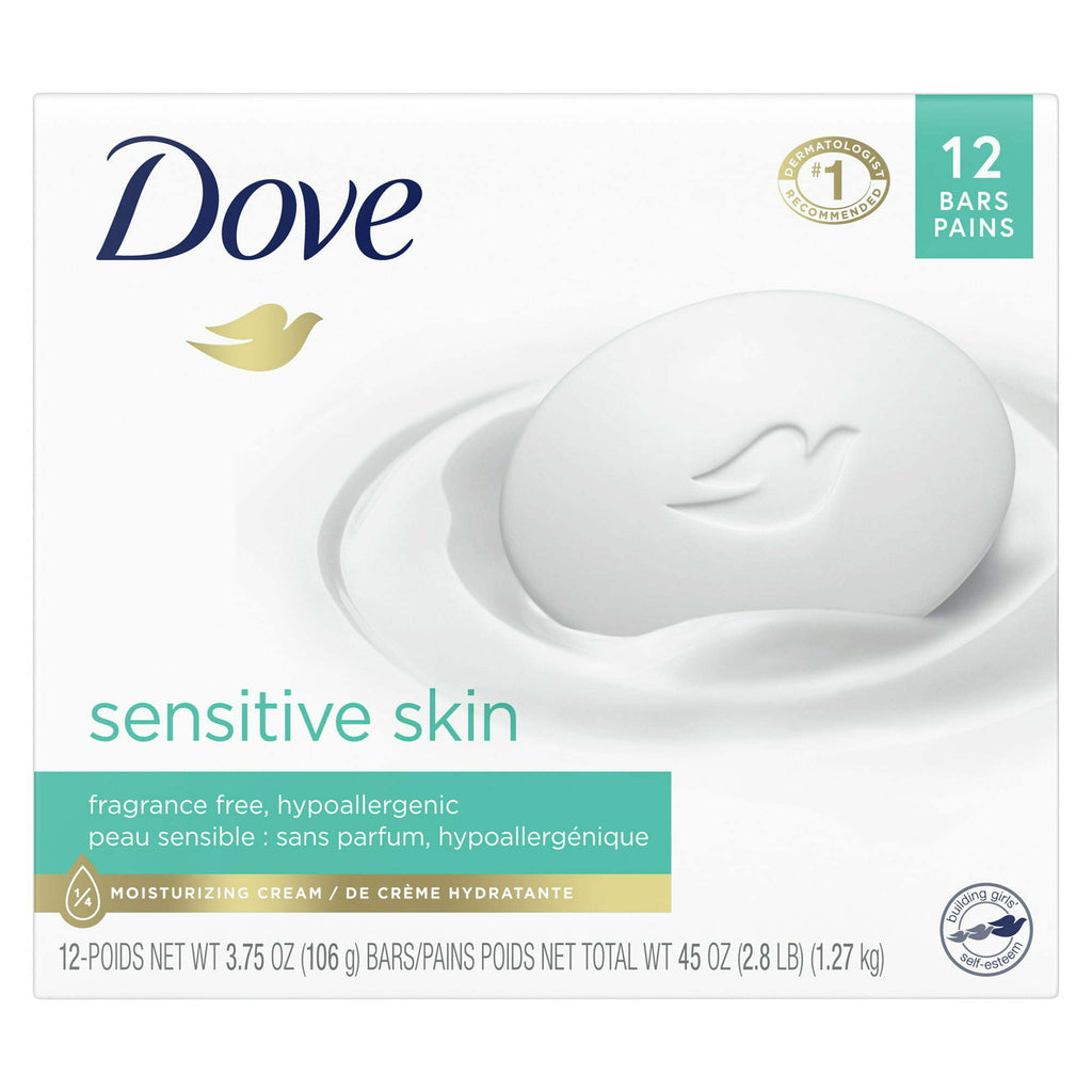 Dove Beauty Bar More Moisturizing Than Bar Soap Sensitive Skin With Gentle Cleanser for Softer Skin, Fragrance Free, Hypoallergenic 3.75 oz, 12 Bars