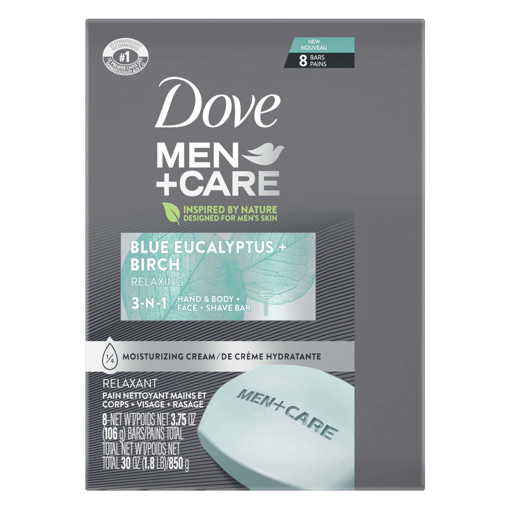 Dove Men+Care 3-in-1 Hand & Body + Face + Shave Bar Relaxing, Blue Eucalyptus, 3.75 oz (8 Bars), Men's skin is 25% thicker and contains higher levels of protein. That means more sweat, lower hydration levels, and easily irritated skin. So, forget about harsh soaps. Add Dove Men+Care Elements Blue Eucalyptus Body and Face Bar to your men's skin care and shower routine! This cleanser for men is specifically designed for men's skin by the #1 dermatologist recommended men's brand since 2013. Regular bar soap for men strips away oil and other essential skin components, leaving you with dry, flaky, and irritated skin. Dove Men+Care is a mild cleanser with plant-based moisturizers and skin-strengthening nutrients to help rebuild skin and skin proteins. Dove Men+Care Body and Face Bar is an easy-to-rinse, hydrating soap that is clinically proven to fight dry skin better than a regular men's body soap.