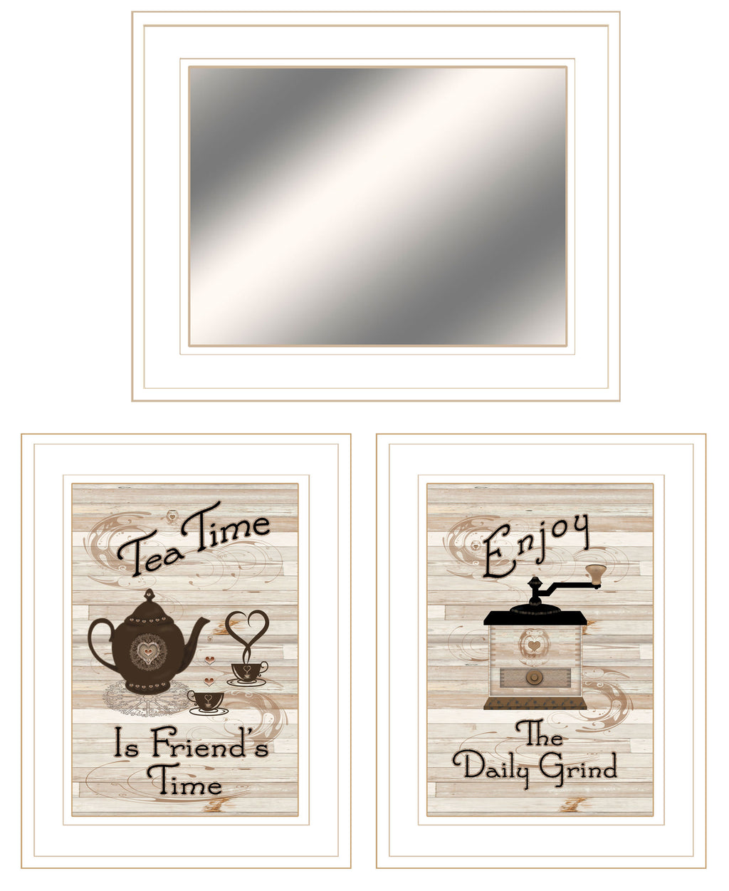 V421-226GM "Enjoy/Tea Time" By Trendy Decor 4U. Three Piece Kitchen Collection features Handmade Decorative white (12x15) framed mirror by Trendy Decor 4U. Includes 2 white framed prints: "Tea Time is friends Time" (11x15) and "Enjoy the Daily grind" (11x15). The surface of the art is coated with a fade resistant texture which gives it a canvas-like appearance. No glass is necessary. Arrives ready to hang. Made in USA.•Women Owned (WBE)•Textured Artwork with a 'rolled on' acid free acrylic coating to create a canvas painting effect. No glass is necessary.•UV protectant coating protects artwork from fading.•Molding adds natural beauty to the framed art. Frame is keyholed for ease of hanging.•Frame is keyholed for ease of hanging.