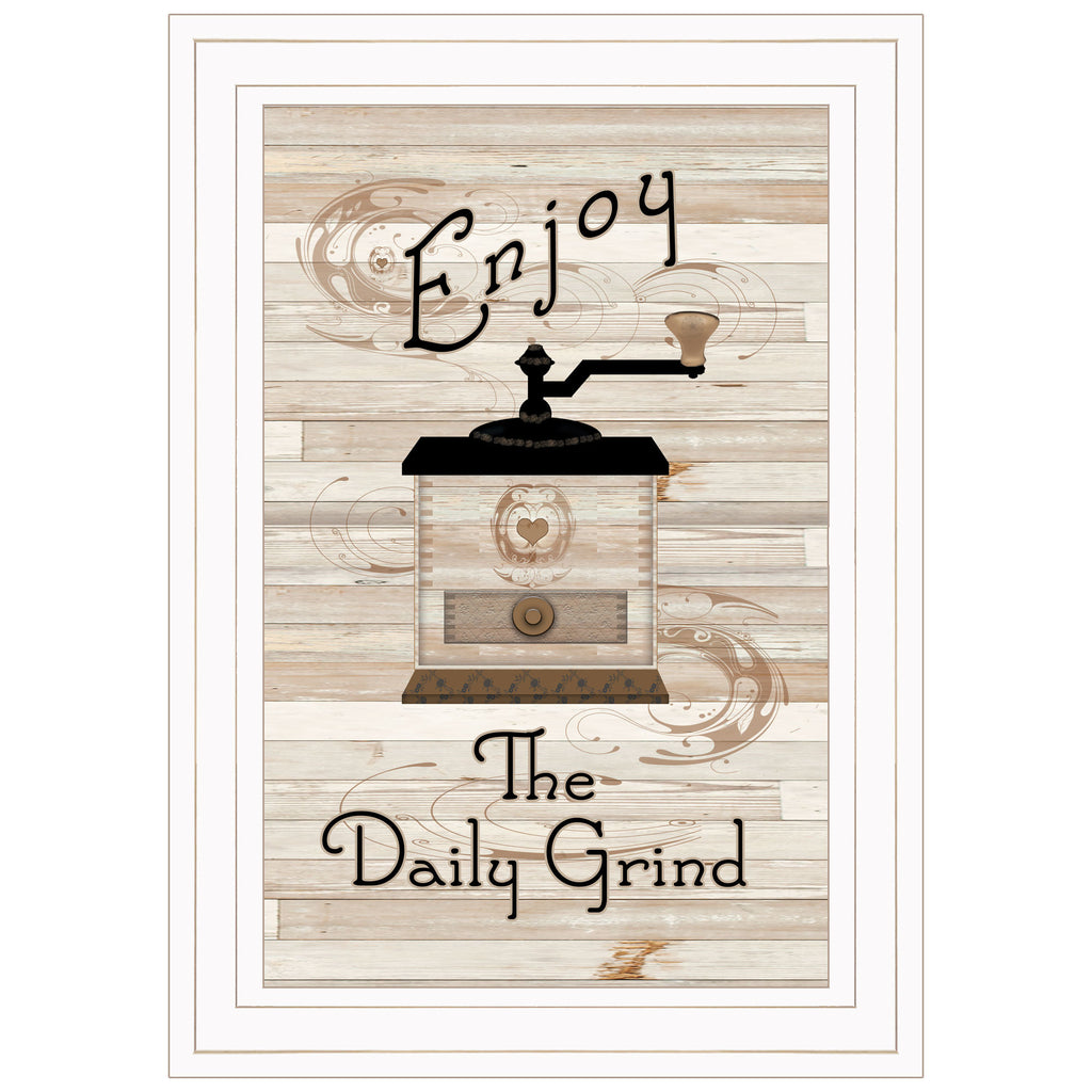 ME27-226G "Enjoy the Daily Grind!" by Trendy decor. This White framed Kitchen print(11x15) says to enjoy our time with our friends; antique old time coffee grinder, cups and saucers, on a tan and white shiplap background. The surface of the prints is textured with a fade resistant coating so no glass is necessary. Arrives ready to hang. Made in the USA by skilled American workers. •Textured Artwork with a 'rolled on' acid free acrylic coating to create a canvas painting effect. No glass is necessary.•Surface of the print has a fade resistant coating.•Arrives Ready to Hang•Woman Owned Business (WBE)•Handmade in the USA•Decorative Moulding adds natural beauty to the framed art.