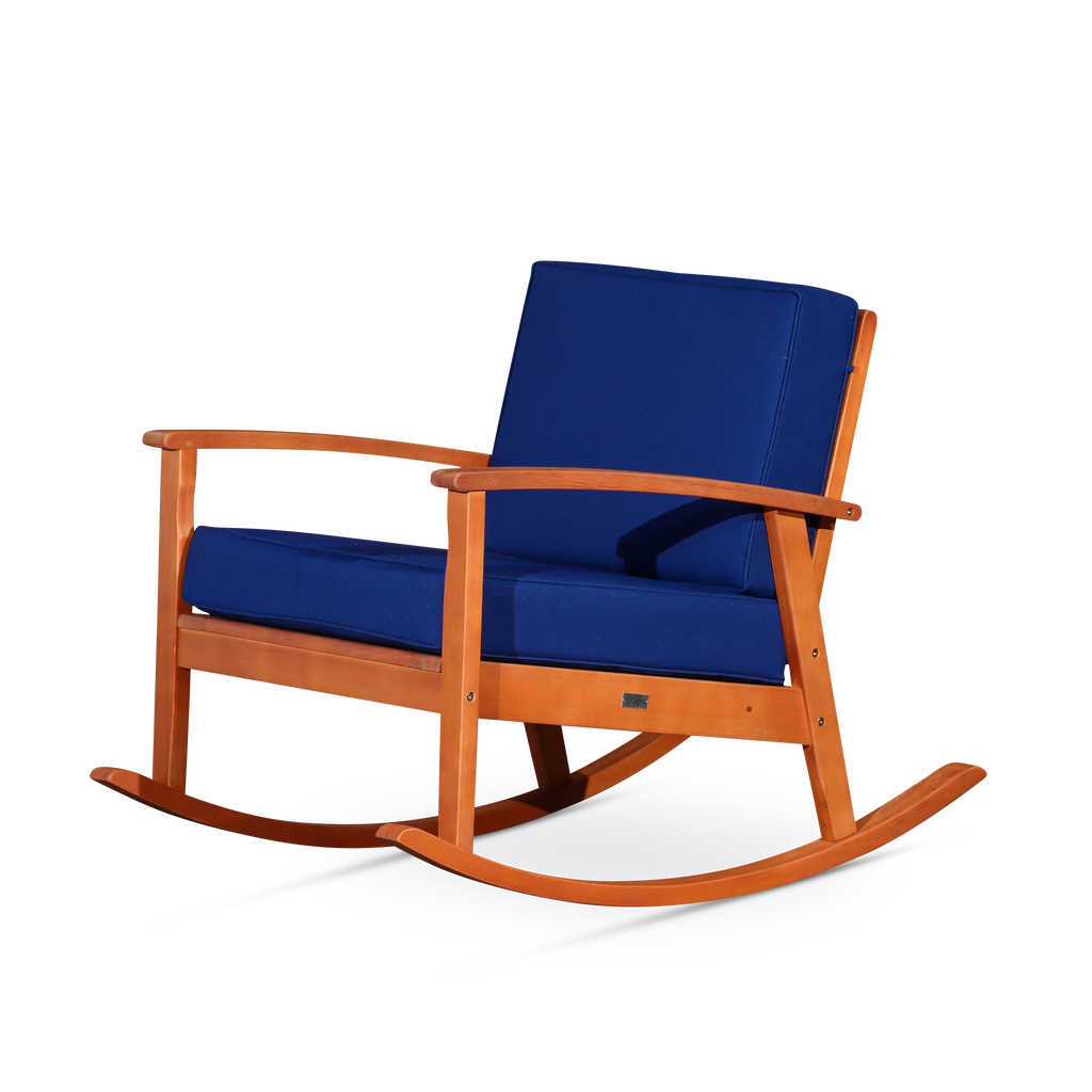 Eucalyptus Rocking Chair with Cushions, Natural Oil, NavyThis deep seat rocker is made for relaxing. The extra wide, extra deep seat is fashioned for comfort. The roomy feel makes it perfect for curling up with a good book or a cup of coffee. This comfy rocker is sure to become a favorite outdoor spot. Our Longs Peak rocker is built to last and will endure many summers of rocking.