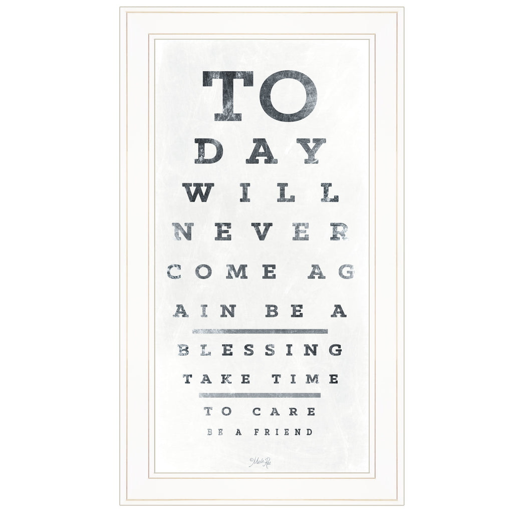 MAZ5265-226G "Eye Chart I" by artisan by Marla Rae. This decorative white framed print 15"x27" of a eye chart will be a conversational piece for any home; take time to read the encouraging word of inspiration on the chart: Today will never come again, be a blessing, take time to care, be a friend. Our products are proudly made by skilled American workers. The surface of our framed art is textured with a fade resistant coating, so no glass is necessary. A vegetable-based glue is used in the production of our products, and our frames are crafted from 100% recycled material. In keeping with our environmentally friendly approach toward manufacturing. To view a 2-piece vignette, including this print, please search: V605-226G•Print has fade resistant surface texture, no glass is necessary•Woman Owned Business (WBE)•Arrives ready to hang, no additional hardware needed on item•IndIvIdually hand crafted by skilled AmerIcan workers•Clean with Soft Dry Cloth Only