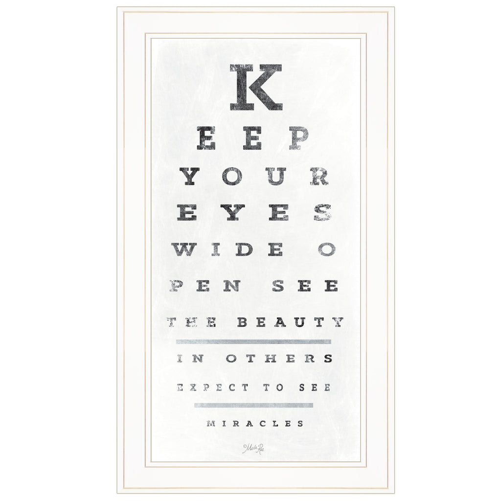 MAZ5266-226G "Eye Chart II" by artisan by Marla Rae. This decorative white framed print 15"x27" of a eye chart will be a conversational piece for any home; take time to read the encouraging word of inspiration on the chart: Keep Your Eyes Wide Open, See The Beauty In Others, Expect to See Miracles. Our products are proudly made by skilled American workers. The surface of our framed art is textured with a fade resistant coating, so no glass is necessary. A vegetable-based glue is used in the production of our products, and our frames are crafted from 100% recycled material. In keeping with our environmentally friendly approach toward manufacturing. To view a 2-piece vignette, including this print, please search: V605-226G•Print has fade resistant surface texture, no glass is necessary•Woman Owned Business (WBE)•Arrives ready to hang, no additional hardware needed on item•IndIvIdually hand crafted by skilled AmerIcan workers•Clean with Soft Dry Cloth Only