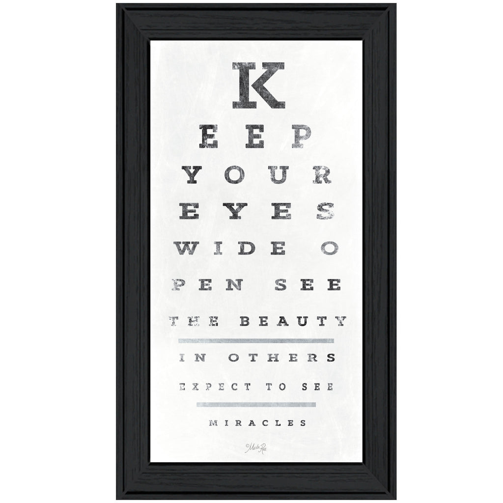 MAZ5266-405 "Eye Chart II" by artisan by Marla Rae. This decorative black framed print (15x27) of a eye chart will be a conversational piece for any home; take time to read the encouraging word of inspiration on the chart: Keep Your Eyes Wide Open, See The Beauty In Others, Expect to See Miracles. This framed art is totally American made. The surface of the art is coated with a fade resistant texture which gives it a canvas-like appearance. No glass is necessary. Arrives ready to hang. To view a 2-piece vignette, including this print, please search: V605-405•Print has fade resistant surface texture, no glass is necessary•Woman Owned Busines (WBE)•Arrives ready to hang, no additional hardware needed on item•individually hand crafted by skilled American workers•frame mitered with precision equipment•Framed art with no glass for safety around children