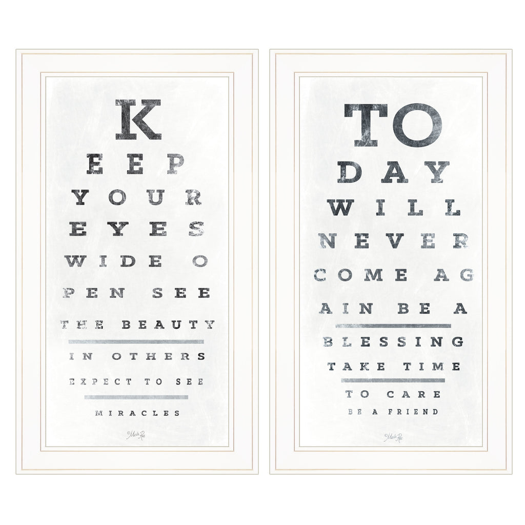 V605-226G "Eye Charts" by artisan Marla Rae. This white framed vignette of 2-(15x27) eye charts gives a special message with them: One eye chart says" Keep Your Eyes Wide Open See The Beauty In Others Expect To See Miracles". The other eye chart says "Today Will Never come Again Be A Blessing Take Time To Care Be A Friend". Perfect messages in an interesting way...by testing your eye sight. The surface of the print is textured with a fade resistant coating so no glass is necessary. Arrives ready to hang. Made in the USA by skilled American workers.•Print has fade resistant surface texture, no glass is necessary•Woman Owned Busines (WBE)•Arrives ready to hang, no additional hardware needed on item•individually hand crafted by skilled American workers•Decorative grouping in matching frames