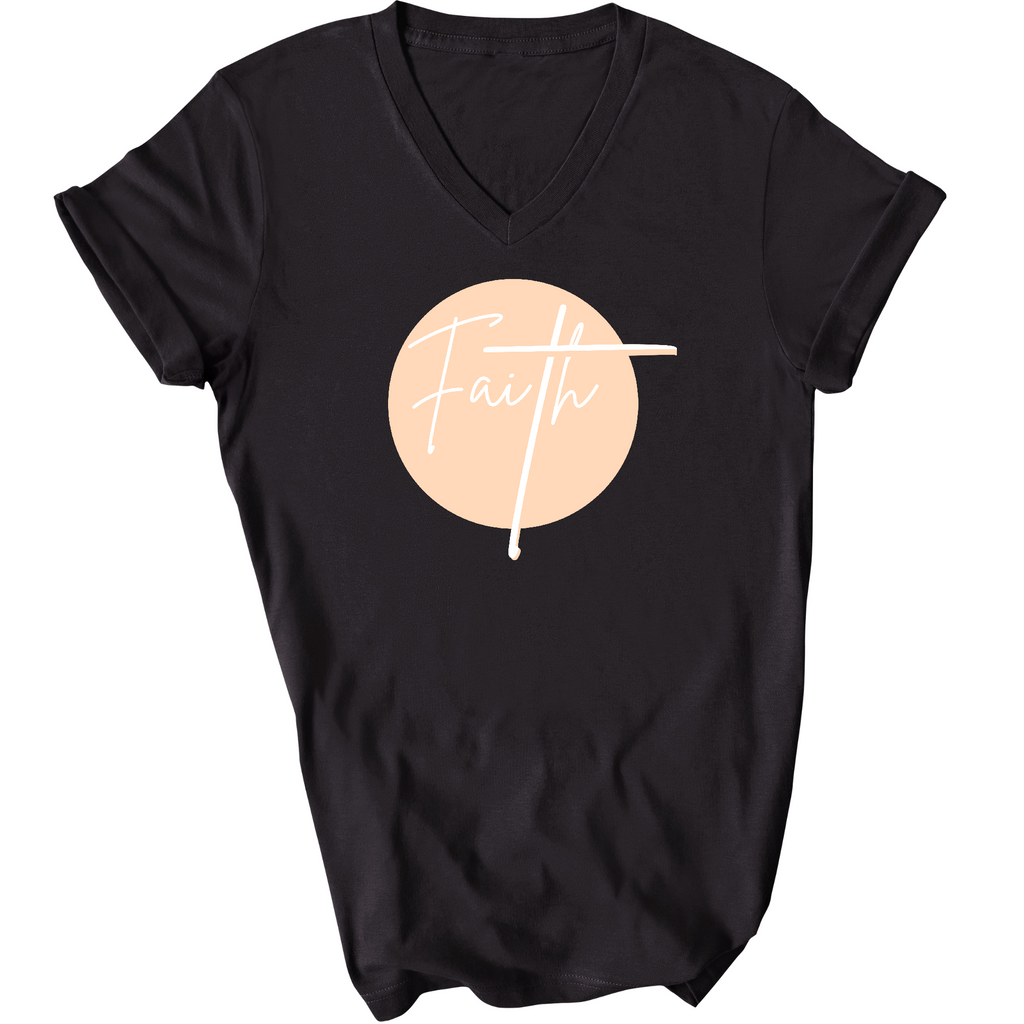 Faith - Christian Affirmation - Peach And White Mens V-Neck T-Shirt. This T-shirt is both durable and comfortable. Made with preshrunk cotton, which means the shirt retains its softness and size after being washed.