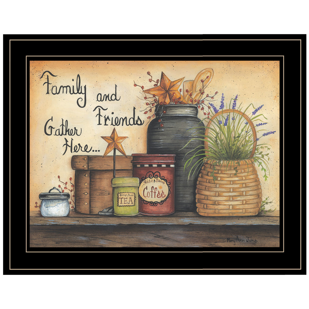 MARY332-704G "Family and Friends" is a 19" x 15" black framed art print by Mary June. This artwork features the phrase "Friends and Family Gather Here". Print shows a shelf of primitive items: basket of lavender, old tin vase, primitive star, wooden coffee containers, tea, on a beautiful wooden shelf. This totally American Made wall decor item features an decorative black frame. The framed art print has a protective, archival finish (glass is not needed) and arrives ready to hang. •Textured Artwork with a 'rolled on' acid free acrylic coating to create a canvas painting effect. No glass is necessary.•Surface of the print has a fade resistant coating.•Arrives Ready to Hang•Woman Owned Business (WBE)•Handmade in the USA•Decorative Moulding adds natural beauty to the framed art.