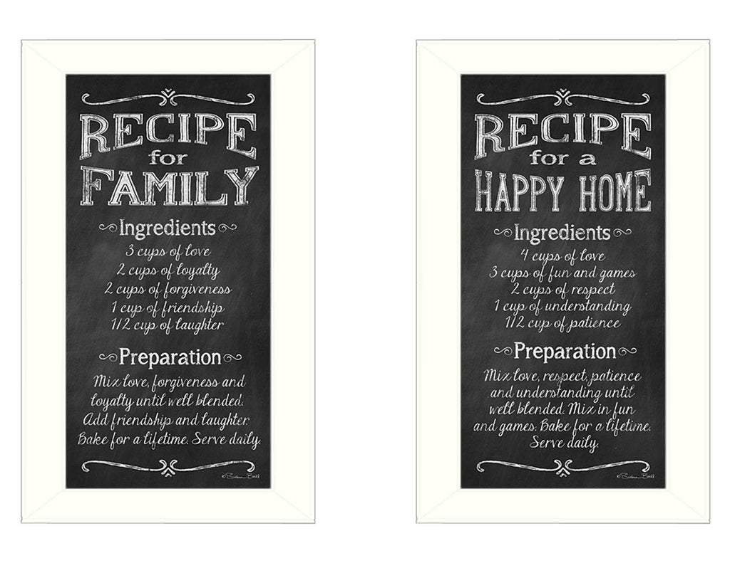 Family Recipe is 2 - 11"x20" framed prints by artist Susan Ball. This 2 piece collection consists of: Recipe for Family which list ingredients for a happy family-love, loyalty, etc. Recipe for a Happy Home which lists ingredients for a happy family-love, fun and games, etc. This collection arrives framed, textured and is ready to hang.•Women Owned (WBE)•Textured Artwork with a 'rolled on' acid free acrylic coating to create a canvas painting effect. No glass is necessary.•UV protectant coating protects artwork from fading.•MDF moulding adds natural beauty to the framed art. Frame is keyholed for ease of hanging.