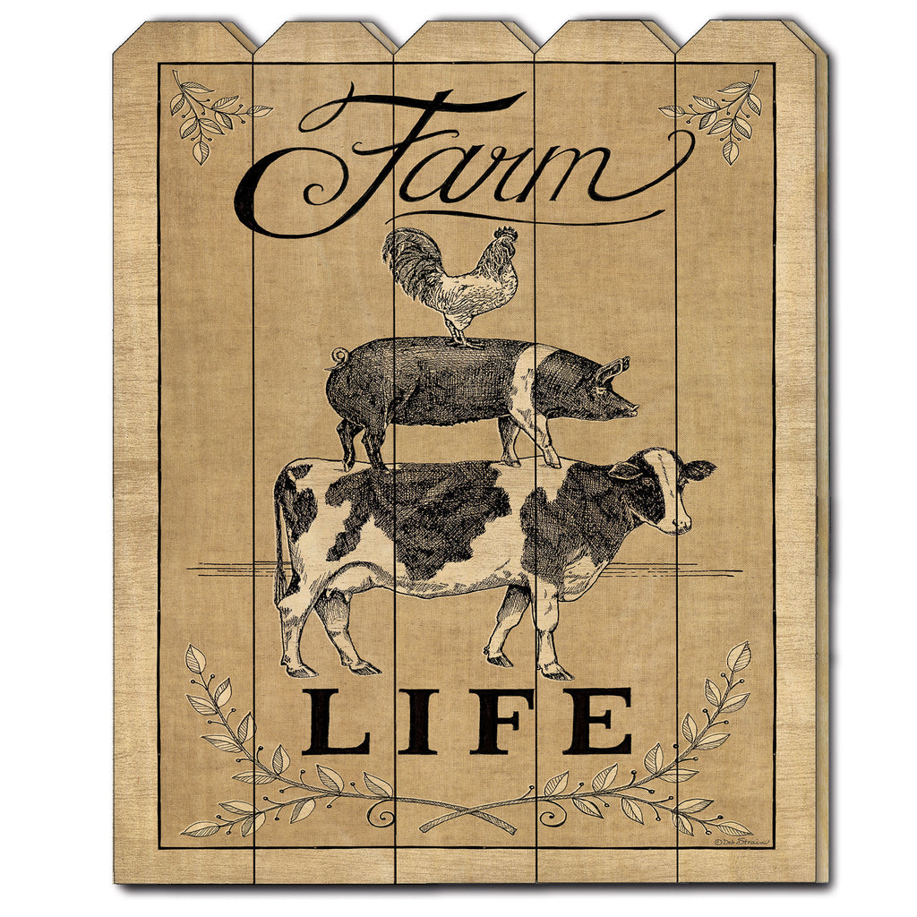 DS1451P - Farm Life by Deb Strain. Art of farm animals printed on a 16 x 20 wood picket fence. You will see the rooster on the top, the pig in the middle of the back of the COW, and the COW on the bottom. Arrives ready to hang. Made in the USA by skilled American workers. • ARTWORK is printed on a wooden fence.•Sawtooth hanger on the back makes this beautiful artwork ready to hang.•Baltic Birch grain pattern adds natural beauty to the framed art. Fence has sawtooth hanger for the ease of hanging.•THIS FINE HOME DECOR piece made in the USA by Woman Owned Business (WBE) is a perfect gift for a friend or relative.