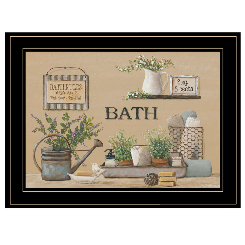 BR466-704G "Farmhouse Bath II " by artisan Pam Britton. This decorative black framed 1-pc(19x15) says" Bath House tin sign" in a room that makes you to want relax! Shelf of towels, bath soap, floral, soap everything you need to relax and enjoy. This framed art is totally American made. The surface of the art is coated with a fade resistant texture which gives it a canvas-like appearance. No glass is necessary. Arrives ready to hang. •Women Owned (WBE)•Textured Artwork with a 'rolled on' acid free acrylic coating to create a canvas painting effect. No glass is necessary.•UV protectant coating protects artwork from fading.•Molding adds natural beauty to the framed art. Frame is keyholed for ease of hanging.•Frame is keyholed for ease of hanging.
