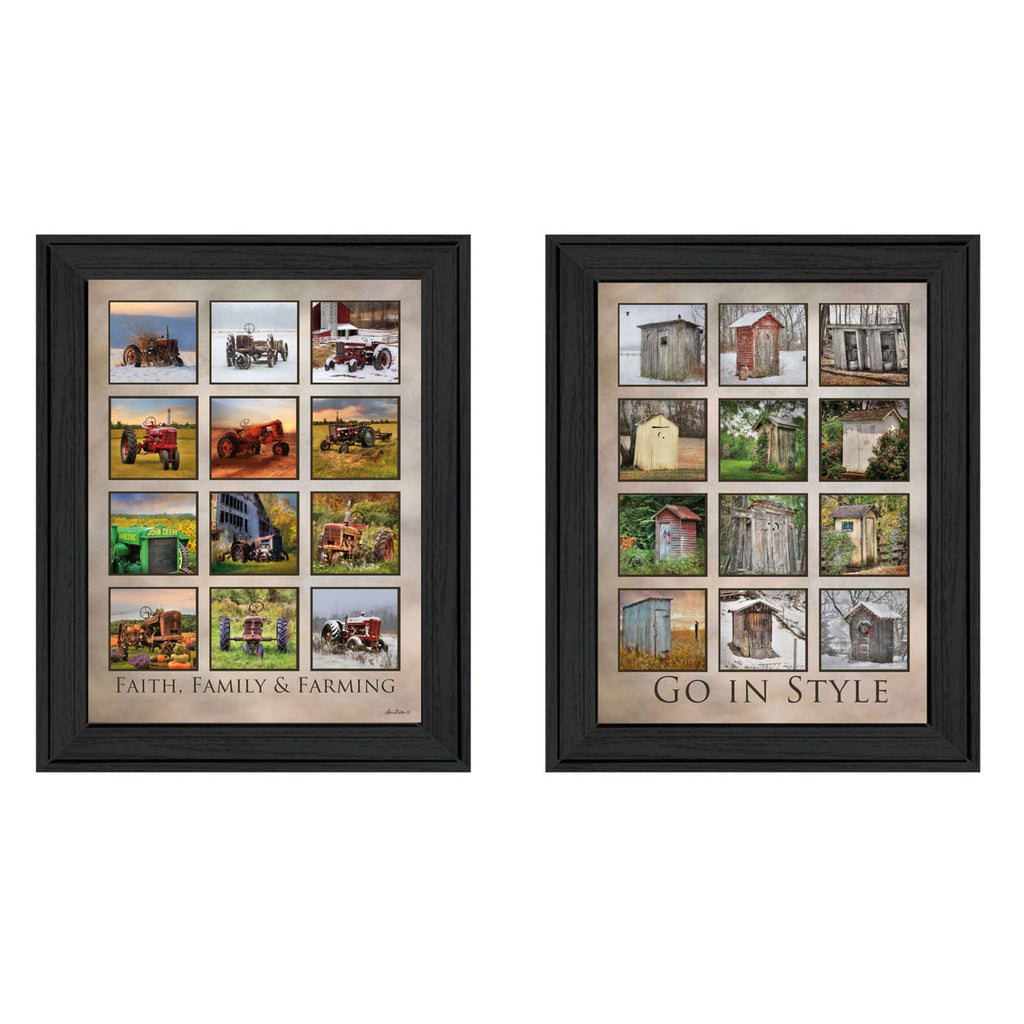 " Farming" vignette are 2-14"x 18" framed art print in a decorative black frame of the art of Lori Deiter. The print shows a collection of vintage tractors and a collection of outhouse pictures. The print has a protective, archival finish (glass is not needed) and arrives ready to hang. Made in the USA with pride by skilled American workers.•Women Owned (WBE)•Textured Artwork with a 'rolled on' acid free acrylic coating to create a canvas painting effect. No glass is necessary.•UV protectant coating protects artwork from fading.•Arrives Ready to Hang
