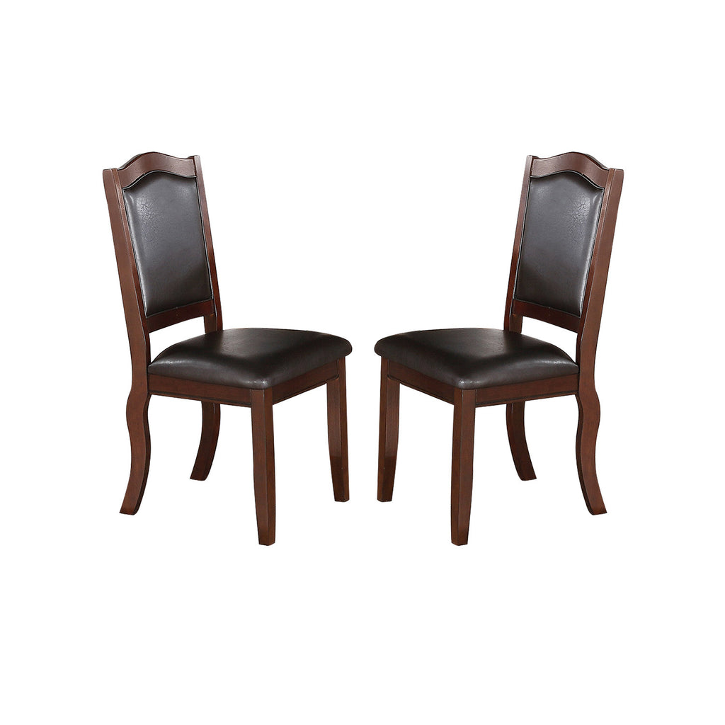 This sophisticated chair exudes a quiet beauty. This dining chair is perfect for any dining room combining comfort with durability and strength. It features tapered front legs, slightly curved hind legs, a padded back, and seat, and a dark brown wood finish. Sold in a convenient set of two.