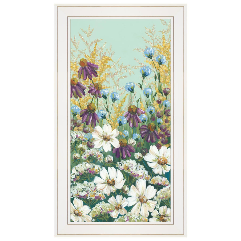 MN101-226G "Floral Field Day" by artisan Michele Norman. This decorative white framed print (15x27) of a field of colorful wildflowers; a burst of blooms arrive in the spring! A wildflower is a flower that grows in the wild, meaning it was not intentionally seeded or planted but you can purchase a packet of the seed: Lupine, Flax, Coreopsis, and Shasta Daisy and many more; sow the seed and set back and enjoy the beauty. This framed art is totally American made. The surface of the art is coated with a fade resistant texture which gives it a canvas-like appearance. No glass is necessary. Arrives ready to hang. To view a 2-piece vignette, including this print, please search: V598-704G•Print has fade resistant surface texture, no glass is necessary•Woman Owned Busines (WBE)•Arrives ready to hang, no additional hardware needed on item•individually hand crafted by skilled American workers•frame mitered with precision equipment