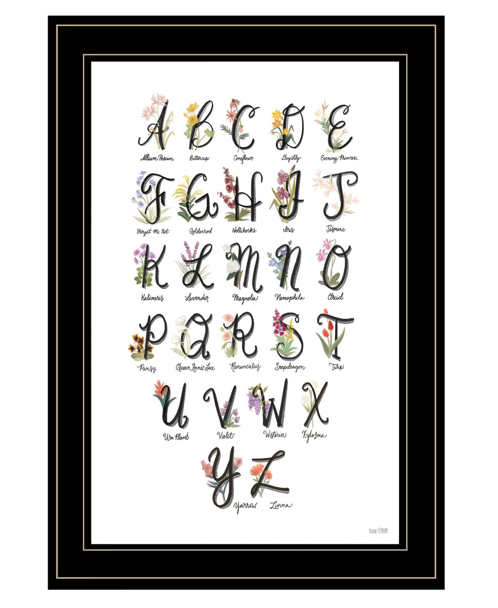 "Flower Alphabet" is by Artisan House Fenway. This 15"X21" decorative black framed wall art. "Flower Alphabet" spelling out a flower for each letter; A is for Allium Pisum, B is for Buttercup…and goes through the whole alphabet. Our products are proudly made by skilled American workers. The surface of our framed art is textured with a fade resistant coating, so no glass is necessary. A vegetable-based glue is used in the production of our products, and our frames are crafted from 100% recycled material. In keeping with our environmentally friendly approach towards manufacturing. Arrives ready to hang.•Print has fade resistant surface texture, no glass is necessary•Woman Owned Business (WBE)•Arrives ready to hang, no additional hardware needed on item•individually hand crafted by skilled American workers•Cleaning Instructions: Clean with Soft Dry Cloth Only•Made in U.S.A.•Artwork by American Artist
