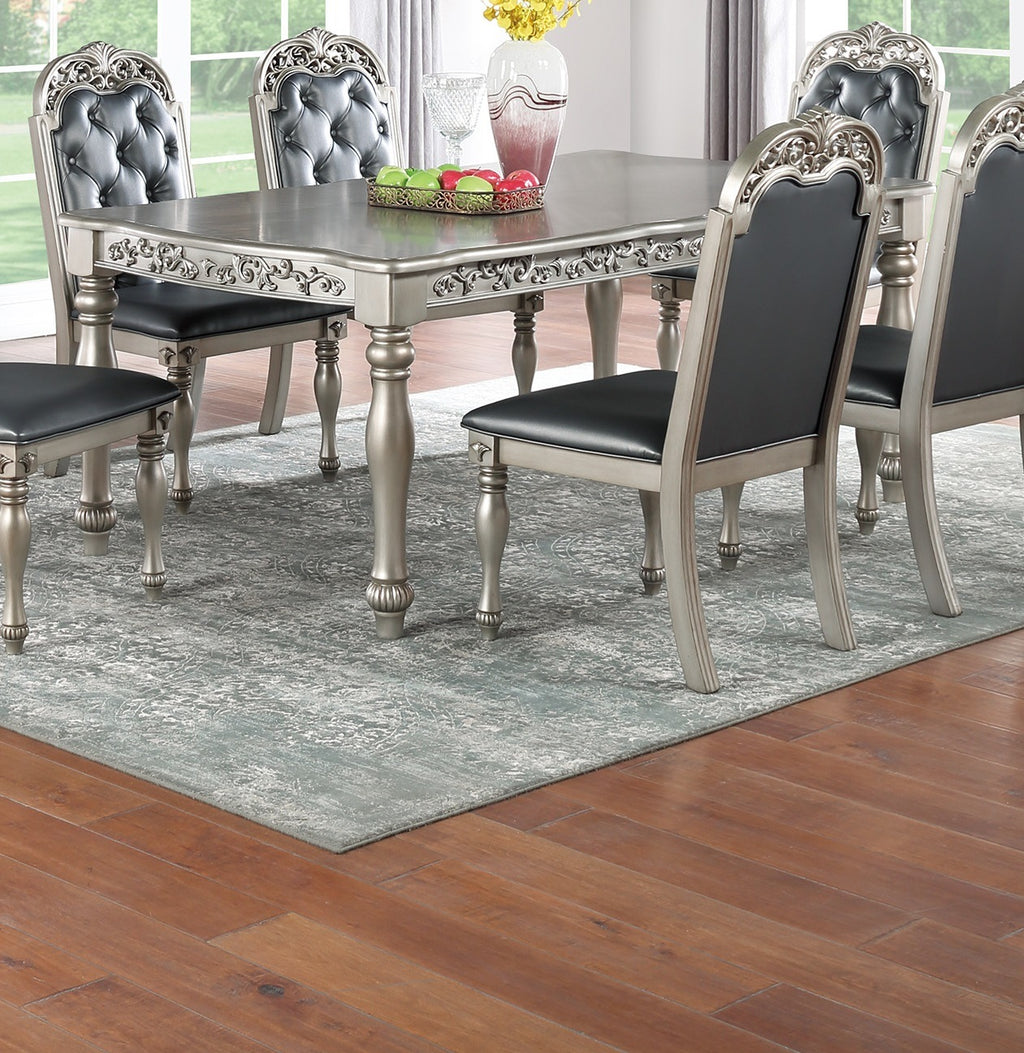 Product Description:Classic and extravagant, this formal dining set is what you need for your dining space. This set is designed to cater to dinner parties or large family gatherings. Perfect for bigger groups and special occasions like thanksgiving and Christmas. With the button tufted design an bold framing, the chairs upholstered with extra cushions.Product Features:Traditional / FormalSilver / Grey FinishRubberwood, Wood Veneer, OthersIntricate Designrectangular table topProduct Dimension:Dining Table : 72" x 42" x 30"HListing Include: 1pc Dining Table Only.Chairs is Not Included.Simple Assembly Required.