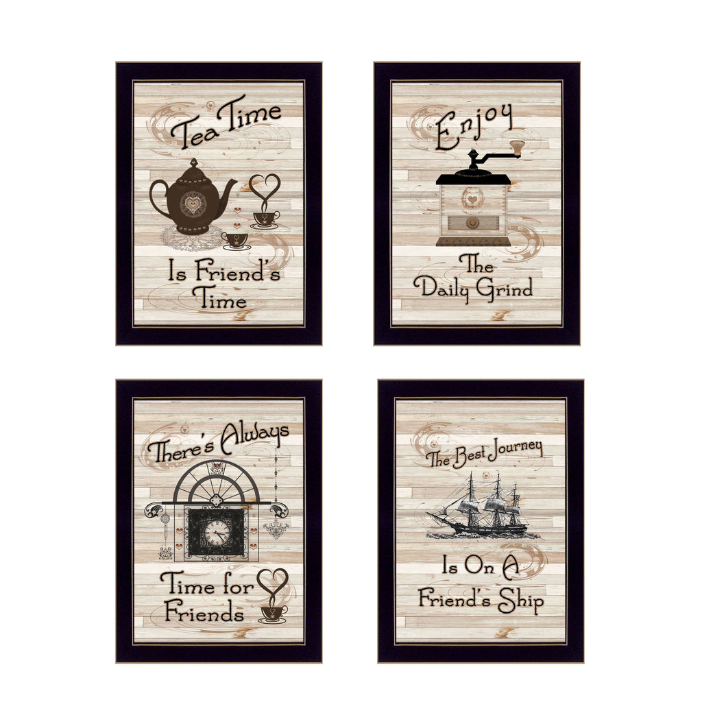 V423-712 Friendship Collection, by the designers at Trendy decor 4U, a grouping of 4 (10 x 14) kitchen decor framed prints in matching black frames: Tea Time, The Daily Grind, Time for Friends, and Friendship Journey. The surface of the prints is textured with a fade resistant coating so no glass is necessary. Arrives ready to hang. Made in the USA by skilled American workers. •TEXTURED ARTWORK with a 'rolled on' acid-free acrylic coating to create a canvas painting effect.•UV PROTECTANT COATING protects artwork from fading. No glass is necessary.• MOULDING adds natural beauty to the framed art. Frame is keyholed for the easy hanging.•THIS FINE HOME DECOR piece made in the USA by Woman Owned Business (WBE) is a perfect gift for a friend or relative.