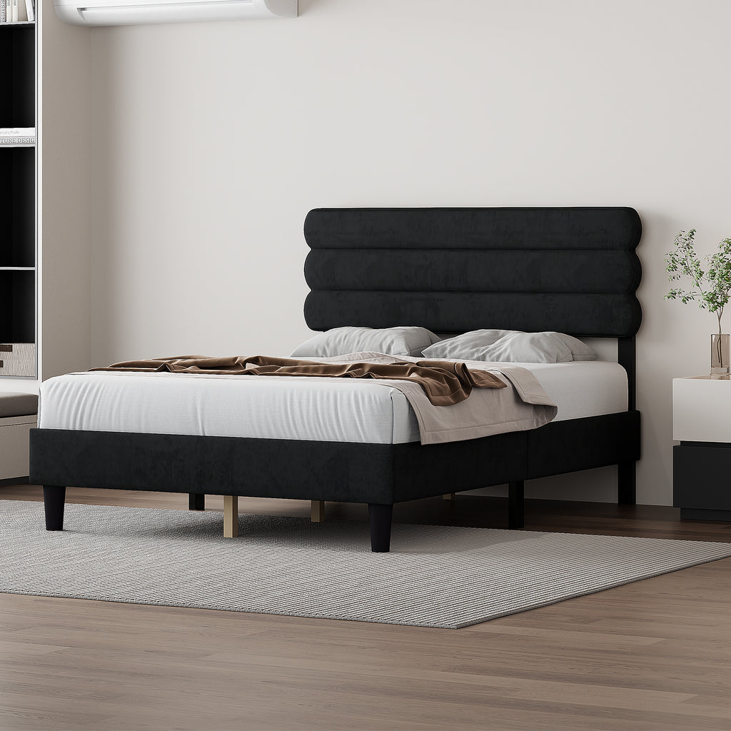 Elegant Design: Full-size bed frame boasts an exquisite design, featuring a headboard crafted from high-quality linen fabric and enveloped in high elastic memory foam. The cushioned side rails provide exceptional comfort for relaxation, while the specially designed Velcro slats make assembly a breeze, effectively eliminating noise