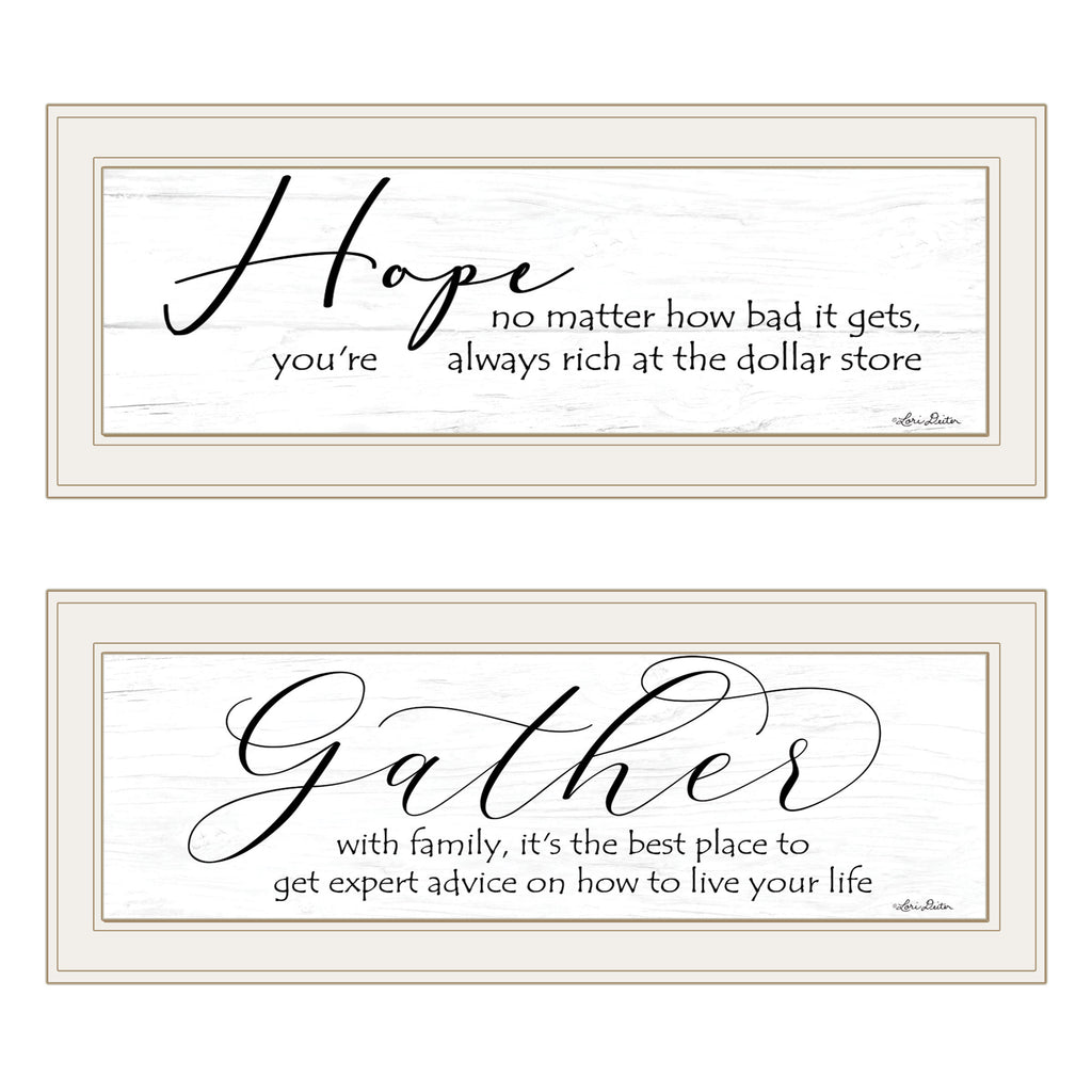 "Gather Together" by artist Lori Deiter. This decorative white framed vignette of 2-23"x11" calligraphy prints for family. Giving hope, advice and love. Prints are UV coated (glass is not needed) and arrives ready to hang.•TEXTURED ARTWORK with a 'rolled on' acid-free acrylic coating to create a canvas painting effect.•UV PROTECTANT COATING protects artwork from fading. No glass is necessary.• MOULDING adds natural beauty to the framed art. Frame is keyholed for the easy hanging.•THIS FINE HOME DECOR piece made in the USA by Woman Owned Business (WBE) is a perfect gift for a friend or relative.