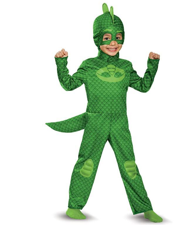 PJ Masks follows the thrilling night time exploits of three young friends who transform into their dynamic super hero alter egos, Cat boy, Owlette and Gekko. Here comes Gekko, who is the youngest of the group, but has Super Gekko Camouflage to change colors and blend in with his surroundings, Super Gekko Muscles to lift heavy things, Super Lizard Grip to climb walls or anchor himself to stop vehicles, and Super Lizard Water Run to walk on water. Now boys can imagine they are their favorite superhero Gekko in this very cool costume