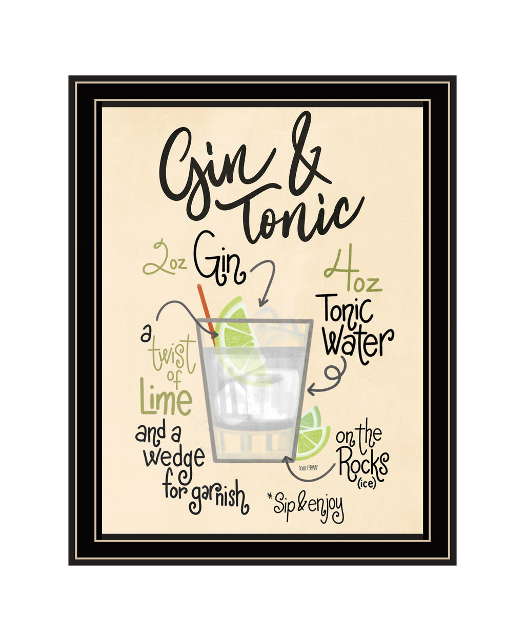 "Gin & Tonic" is by Artisan House Fenway. This 14"X18" decorative black framed wall art. This image features the perfect instructions on how to make a Gin & Tonic. Our products are proudly made by skilled American workers. The surface of our framed art is textured with a fade resistant coating, so no glass is necessary. A vegetable-based glue is used in the production of our products, and our frames are crafted from 100% recycled material. In keeping with our environmentally friendly approach towards manufacturing. Arrives ready to hang.•Print has fade resistant surface texture, no glass is necessary•Woman Owned Business (WBE)•Arrives ready to hang, no additional hardware needed on item•individually hand crafted by skilled American workers•Cleaning Instructions: Clean with Soft Dry Cloth Only•Made in U.S.A.•Artwork by American Artist