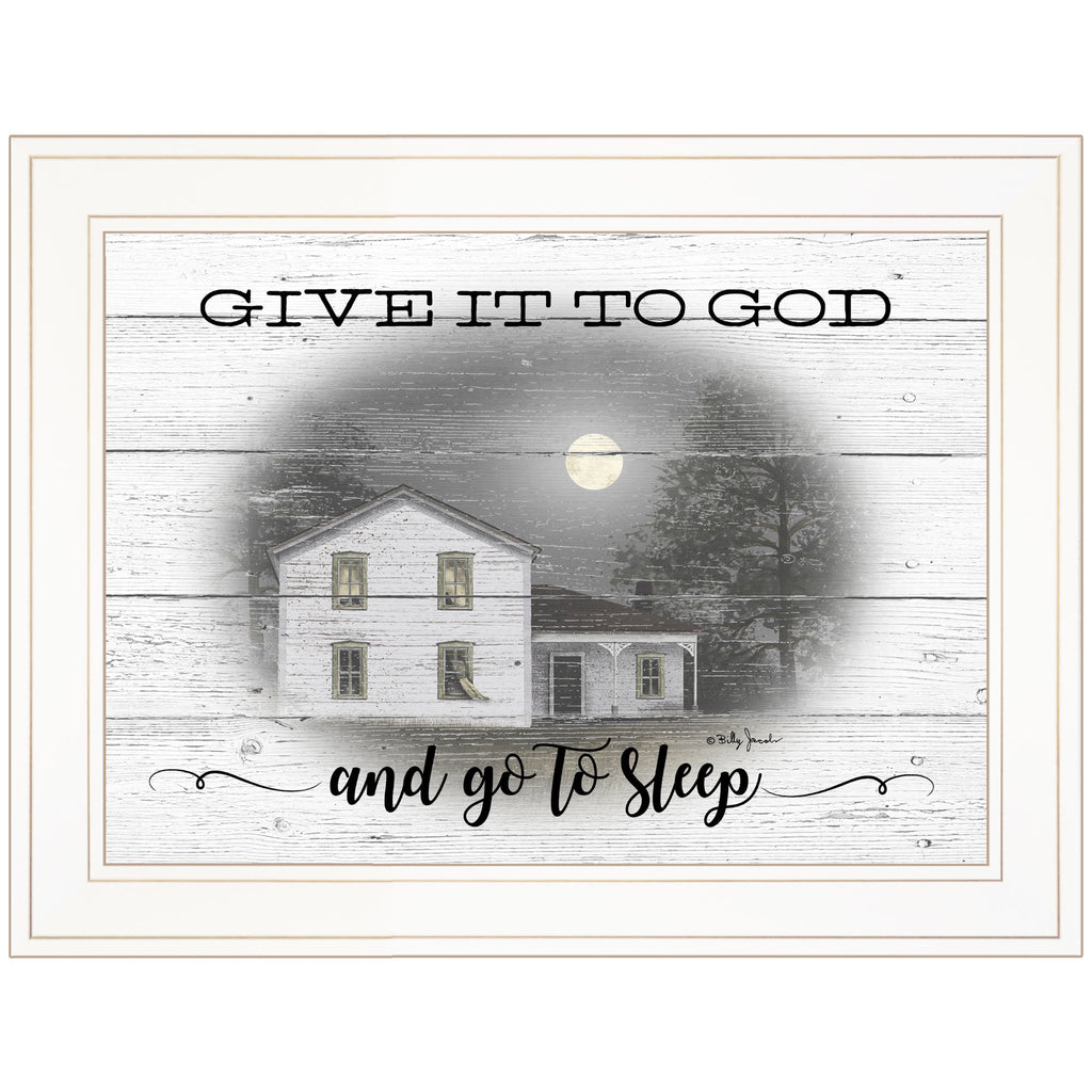 BJ1205-226G "Give it to God" by artisan Billy Jacobs, in a decorative grooved (19x15) white frame. This art features a farm homestead and a barn in the background of the print placed on a shiplap background. Script says: Keeping one hand on the Bible & one hand on the plow. This artwork is drawn by the famous Ohio artisan Billy Jacobs. The surface of the print is textured with a fade resistant coating so no glass is necessary. Arrives ready to hang. Made in the USA by skilled American workers. •Textured Artwork with a 'rolled on' acid free acrylic coating to create a canvas painting effect. No glass is necessary.•Surface of the print has a fade resistant coating.•Arrives Ready to Hang•Woman Owned Business (WBE)•Handmade in the USA•Decorative Moulding adds natural beauty to the framed art.