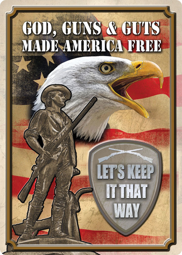 God Guns & Guts Tin SignMeasures: Tin sign measures 12"W x 16.75"H x 3/8"D.