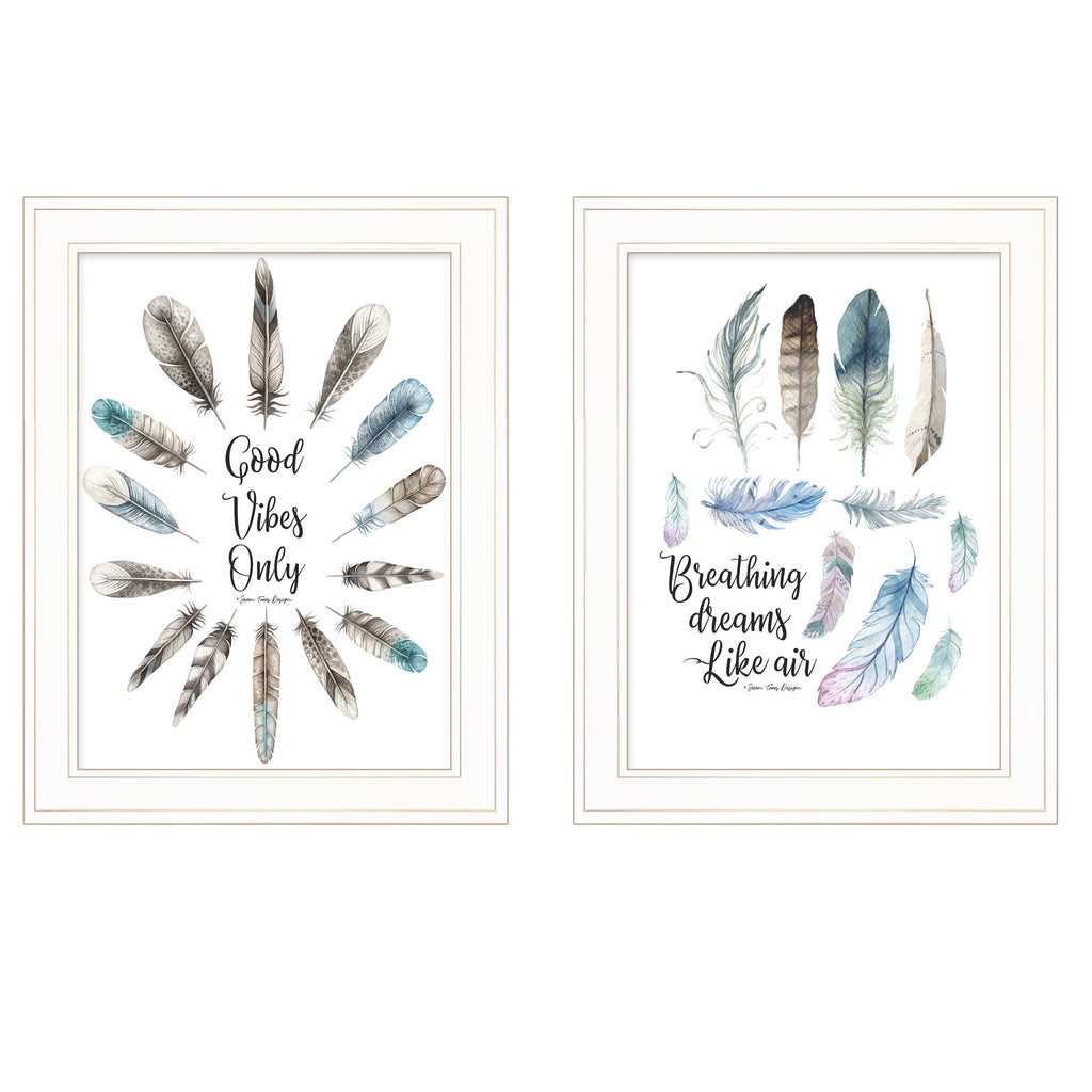 V590-226G Good Vibes by artisan Seven Trees Design. This decorative white frame vignette of (2-15x19) of colorful feathers with the words: Breathing dreams Like air; and Good Vibes Only. The surface of the print is textured with a fade resistant coating so no glass is necessary. Arrives ready to hang. Made in the USA by skilled American workers. •Print has fade resistant surface texture, no glass is necessary•Woman Owned Busines (WBE)•Arrives ready to hang, no additional hardware needed on item•individually hand crafted by skilled American workers•Decorative grouping in matching frames