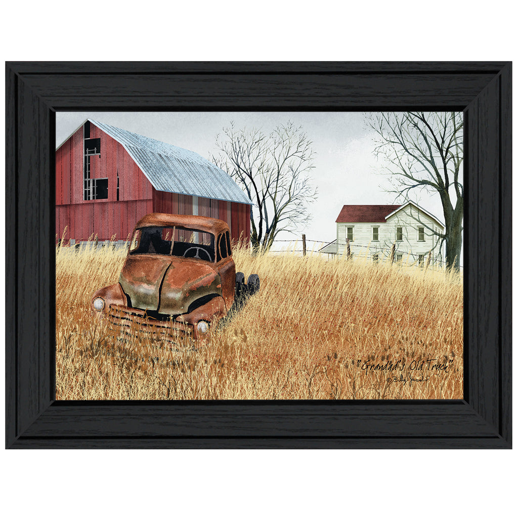BJ1041K-405 "Granddad's Old Truck" an 19 x15 black framed print by Billy Jacobs; Primitive old truck (pickup) rusted and setting in the high weeds behind a barn, and a old farm home. The surface of the print is textured with a fade resistant coating so no glass is necessary. Arrives ready to hang. Made in the USA by skilled American workers. •Textured Artwork with a 'rolled on' acid free acrylic coating to create a canvas painting effect. No glass is necessary.•Surface of the print has a fade resistant coating.•Arrives Ready to Hang•Woman Owned Business (WBE)•Handmade in the USA•Decorative Moulding adds natural beauty to the framed art.