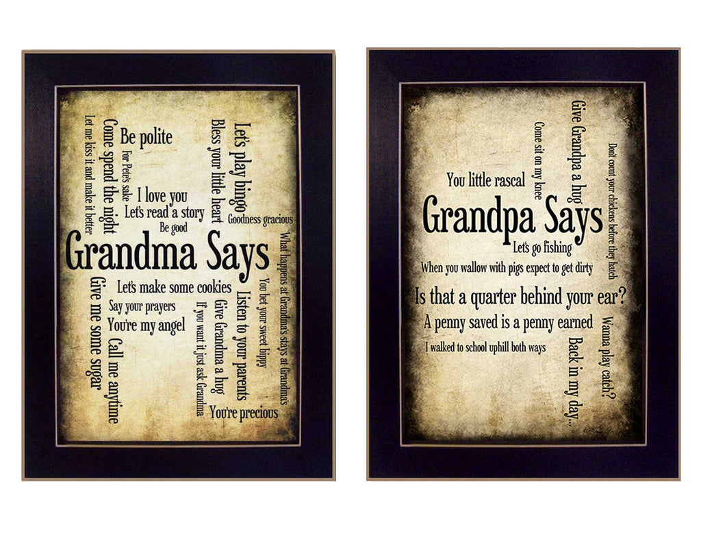 Grandparents is 2 - 10" x 14" framed prints by artist Susan Ball. This 2 piece collection consists of: Grandma Says with sayings your grandma might say - be polite, be good, I love you, etc. Grandpa Says with sayings your grandpa might say - back in my day, wanna play catch, I walked to school uphill both ways, etc. This collection comes textured and is ready to hang.•Women Owned (WBE)•Textured Artwork with a 'rolled on' acid free acrylic coating to create a canvas painting effect. No glass is necessary.•UV protectant coating protects artwork from fading.•MDF moulding adds natural beauty to the framed art. Frame is keyholed for ease of hanging.