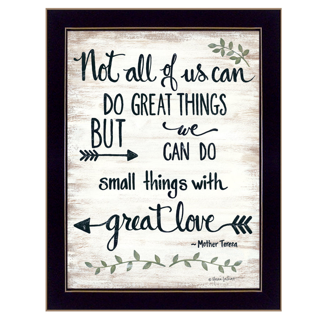 ALP1664-712 Great Love by Annie LaPoint; Black framed size 14x18. Print reminds us to be loving and kind; doing small things that mean a lot to others. The surface of the print is textured with a fade resistant coating so no glass is necessary. Arrives ready to hang. Made in the USA by skilled American workers. •TEXTURED ARTWORK with a 'rolled on' acid-free acrylic coating to create a canvas painting effect.•UV PROTECTANT COATING protects artwork from fading. No glass is necessary.• MOULDING adds natural beauty to the framed art. Frame is keyholed for the easy hanging.•THIS FINE HOME DECOR piece made in the USA by Woman Owned Business (WBE) is a perfect gift for a friend or relative.